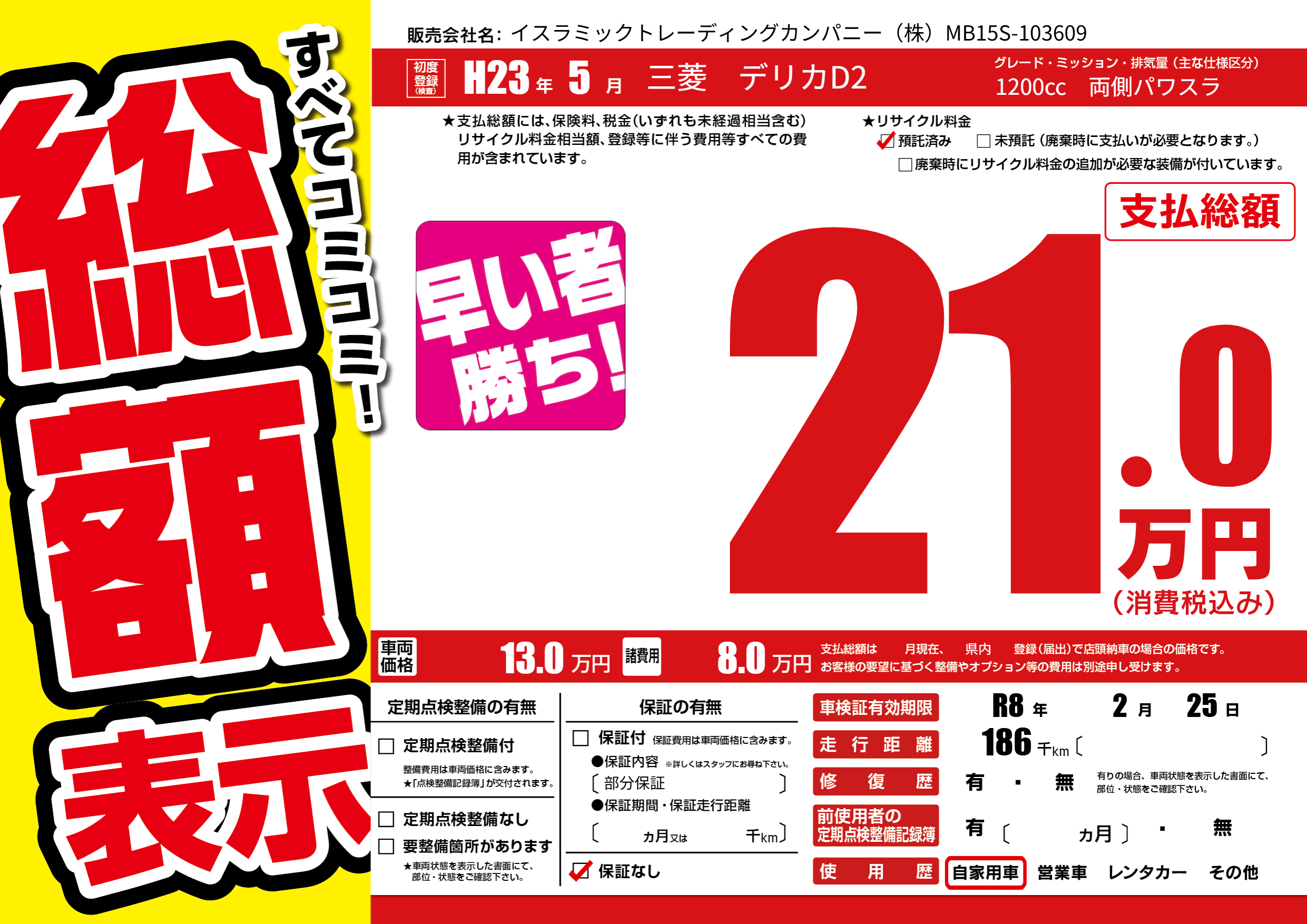 | 走行キロ | 18.6万km | 初年度登録 | H23年5月 |
