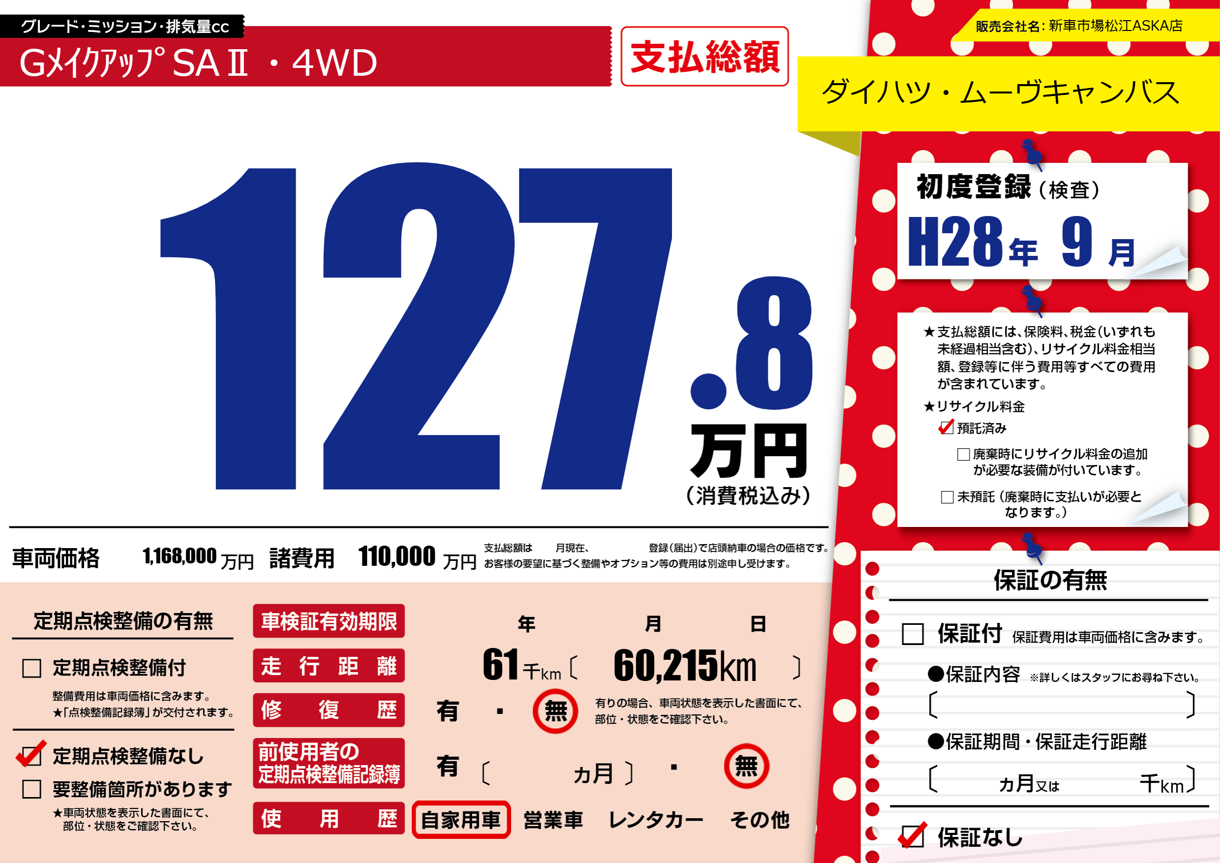 | 走行キロ | 6.1万km | 初年度登録 | H28年9月 |