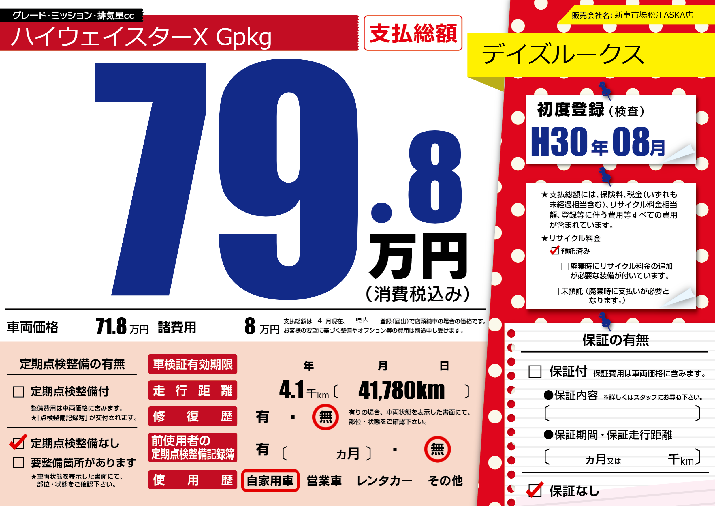 | 走行キロ | 0.4万km | 初年度登録 | H30年08月 |