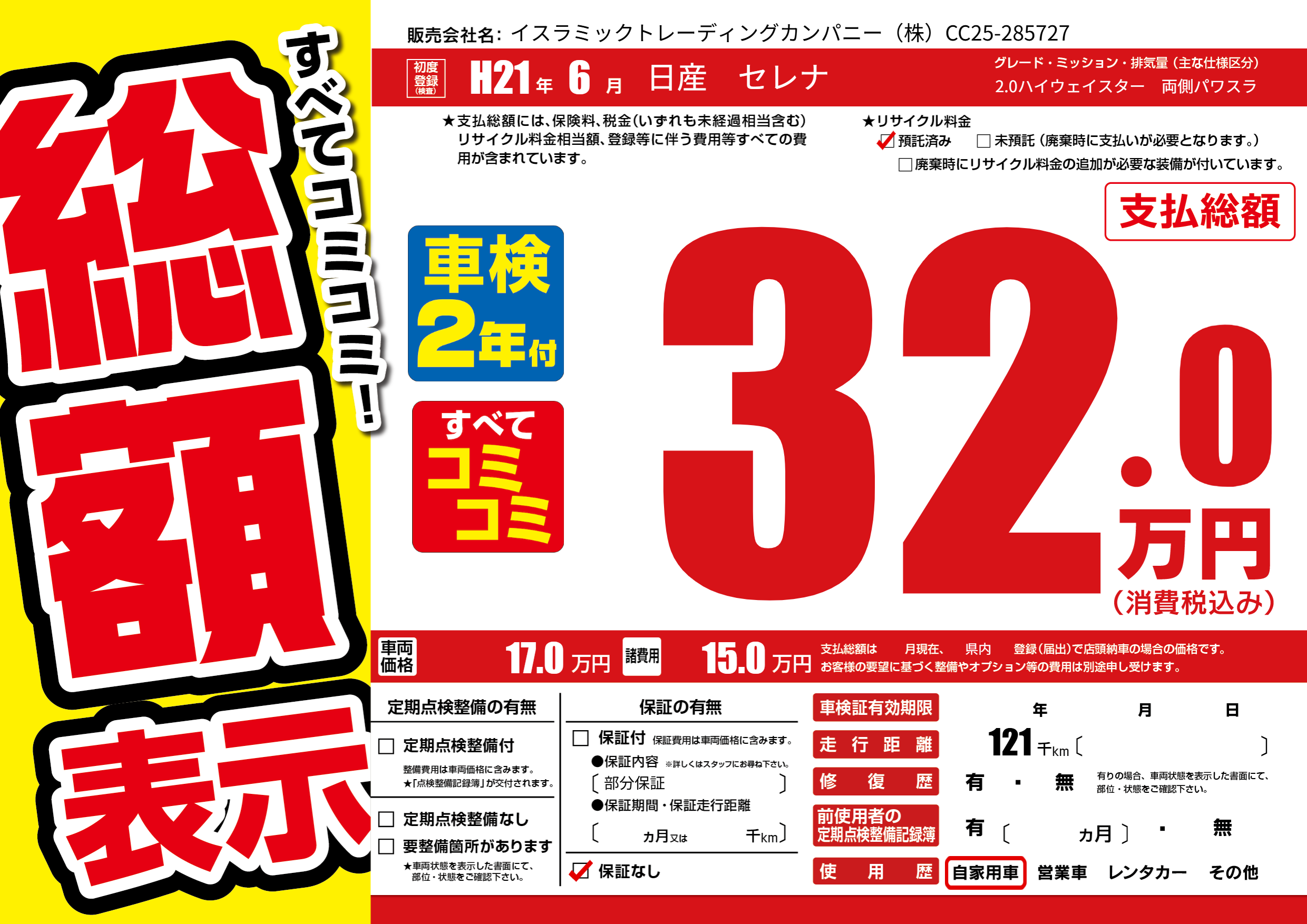 | 走行キロ | 12.1万km | 初年度登録 | H21年6月 |