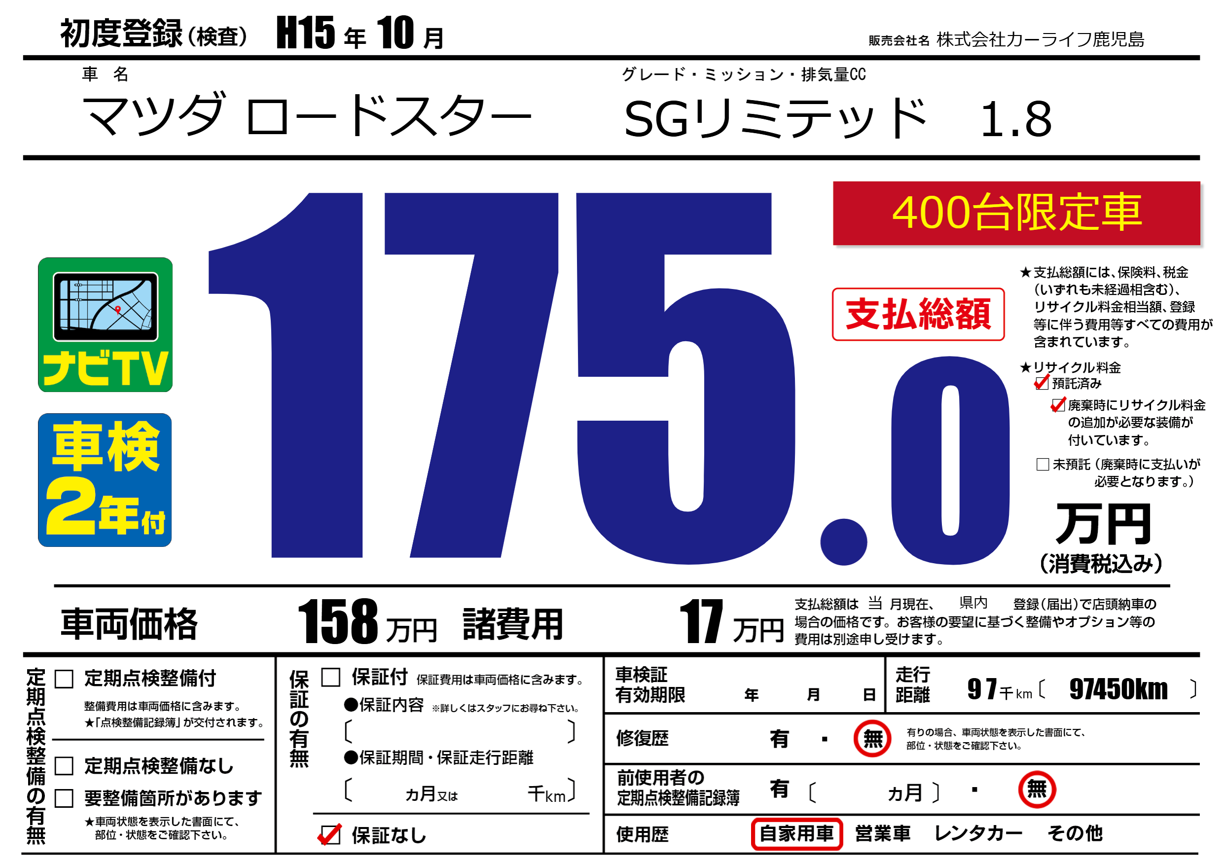 | 車名 | マツダ ロードスター | グレード ミッション 排気量 |