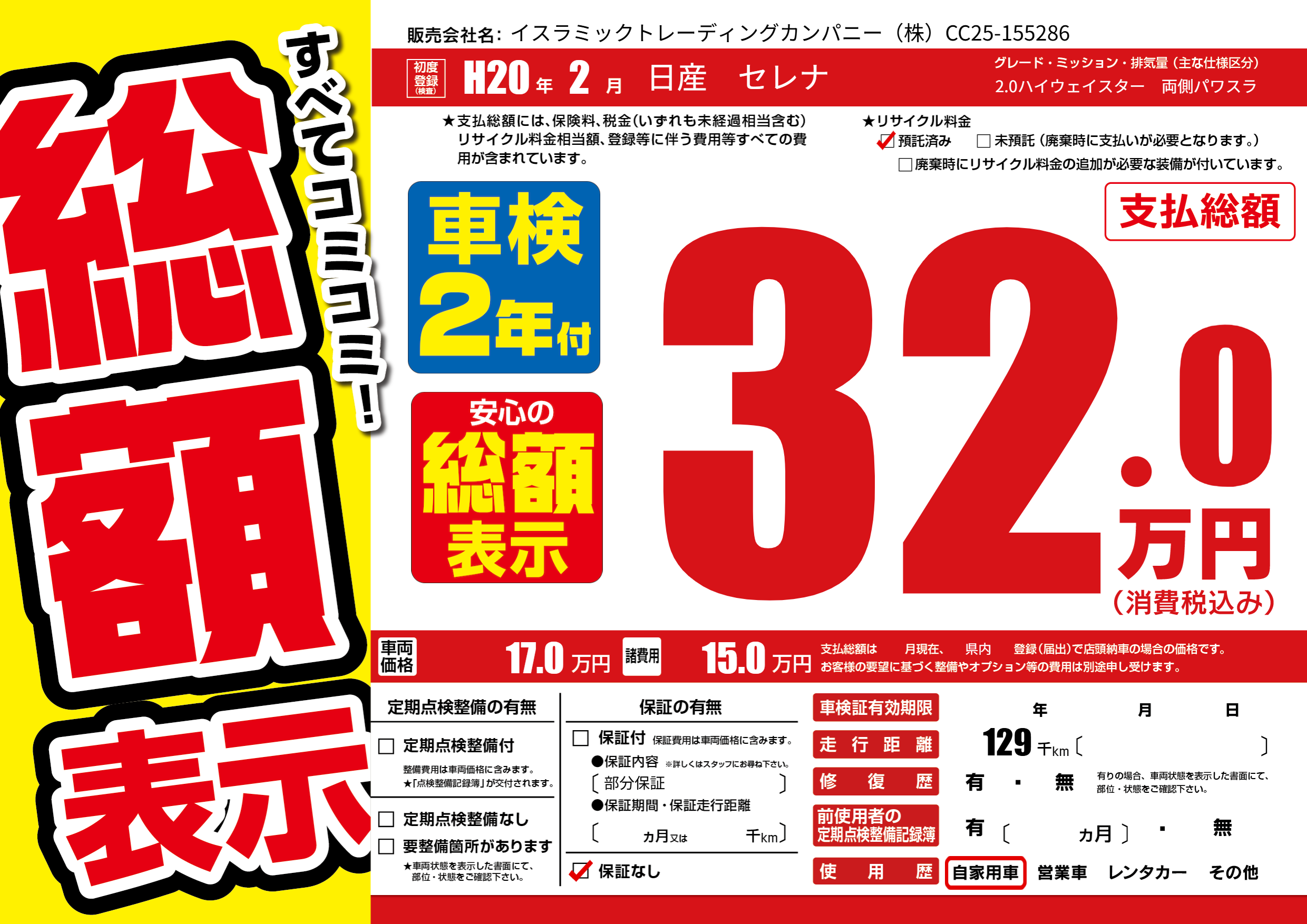 | 走行キロ | 12.9万km | 初年度登録 | H20年2月 |