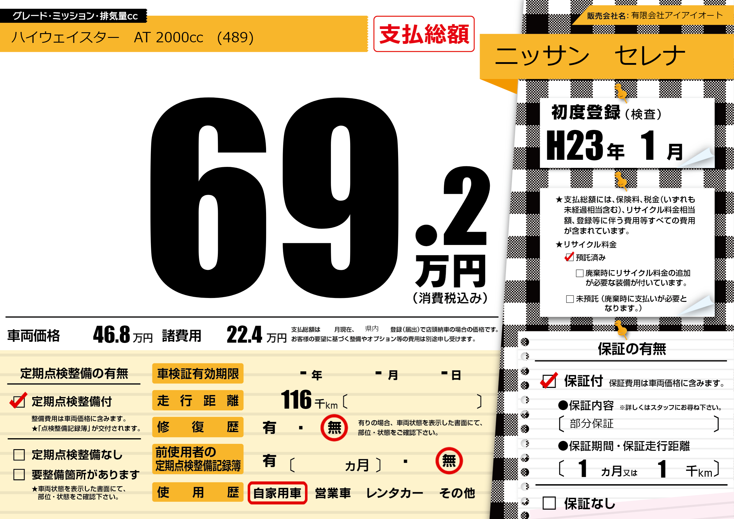 | 走行キロ | 11.6万km | 初年度登録 | H23年1月 |