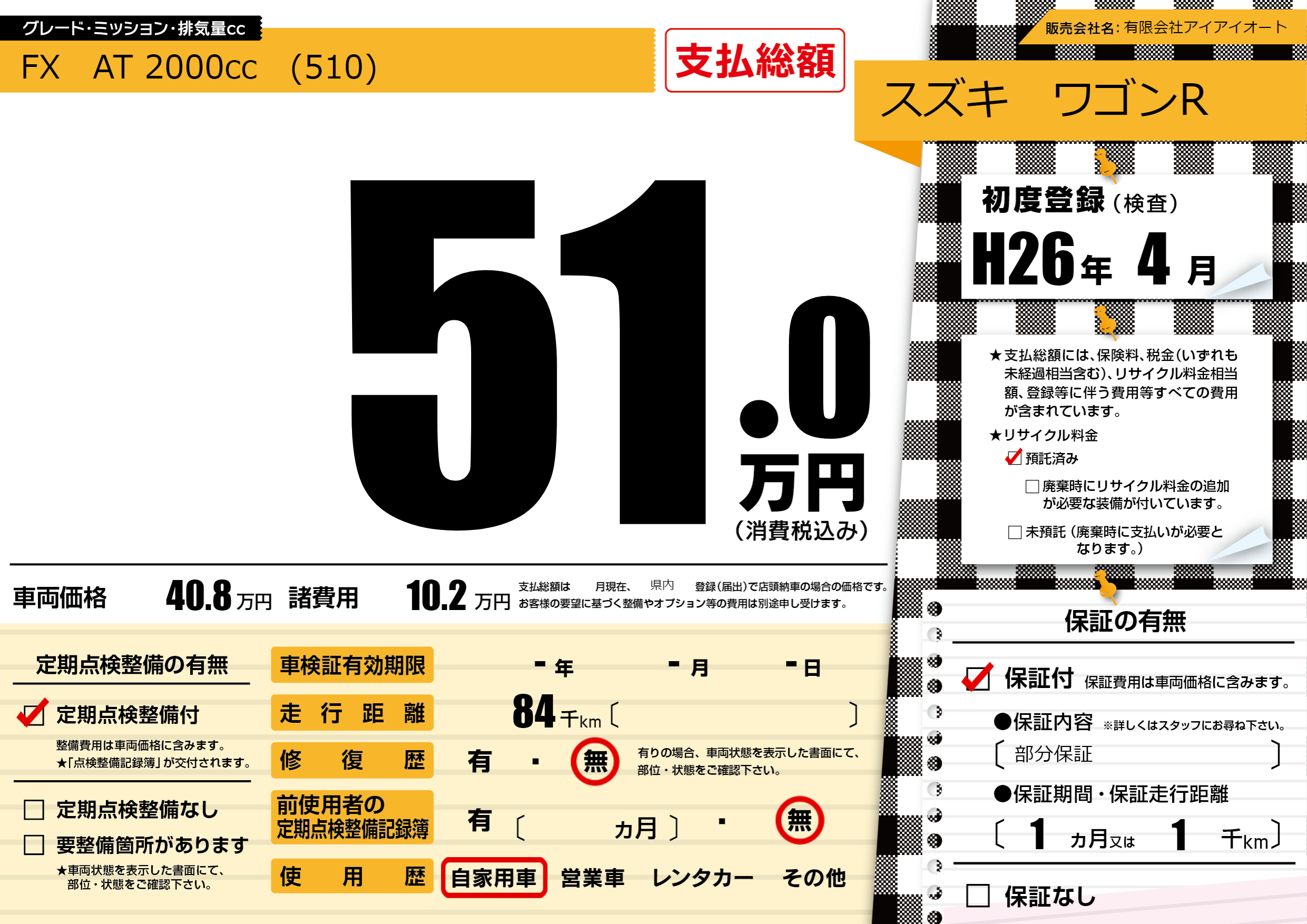 | 車名 | スズキ ワゴンR | グレード ミッション 排気量 |