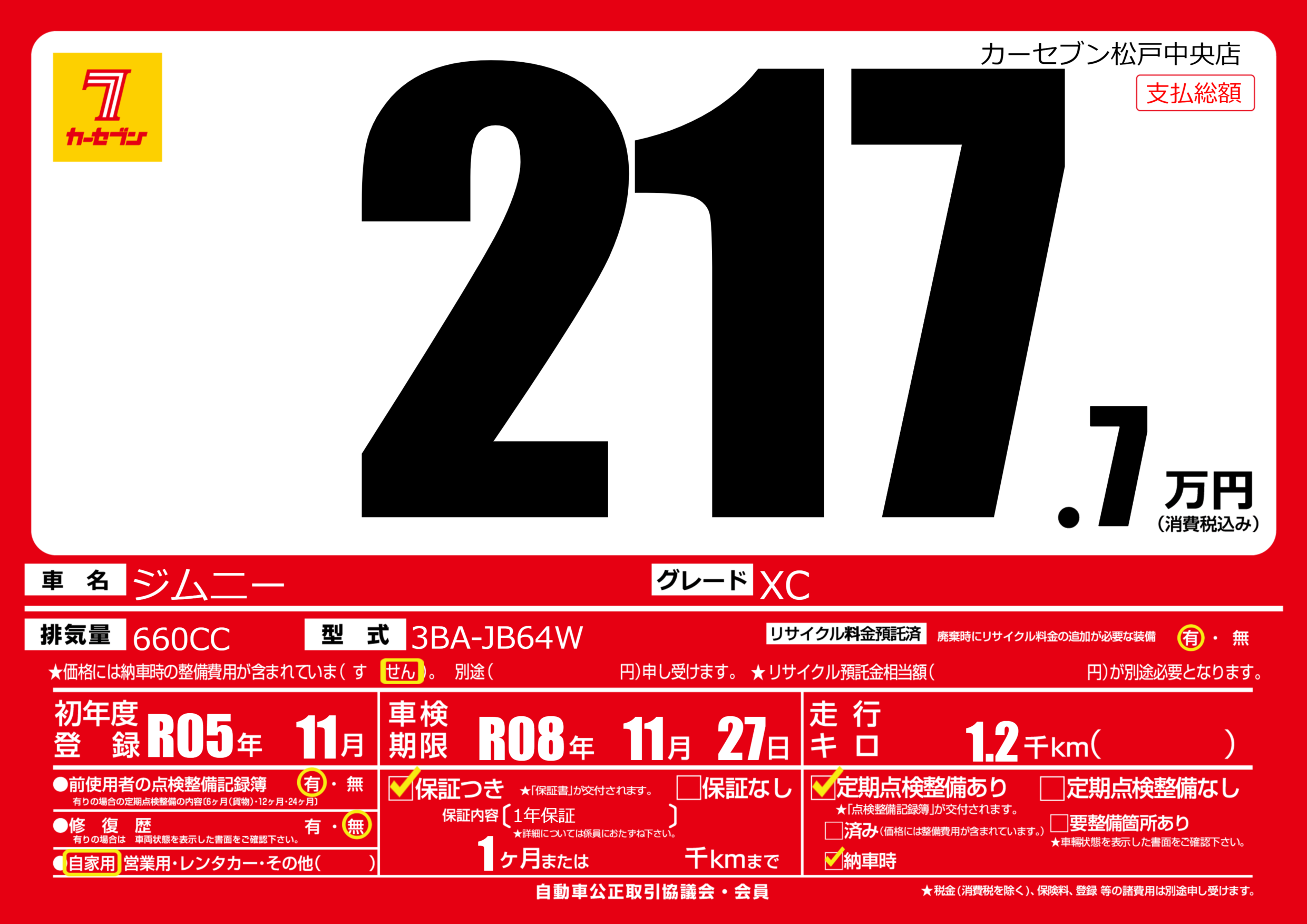 | 車名 | ジムニー | グレード ミッション 排気量 |