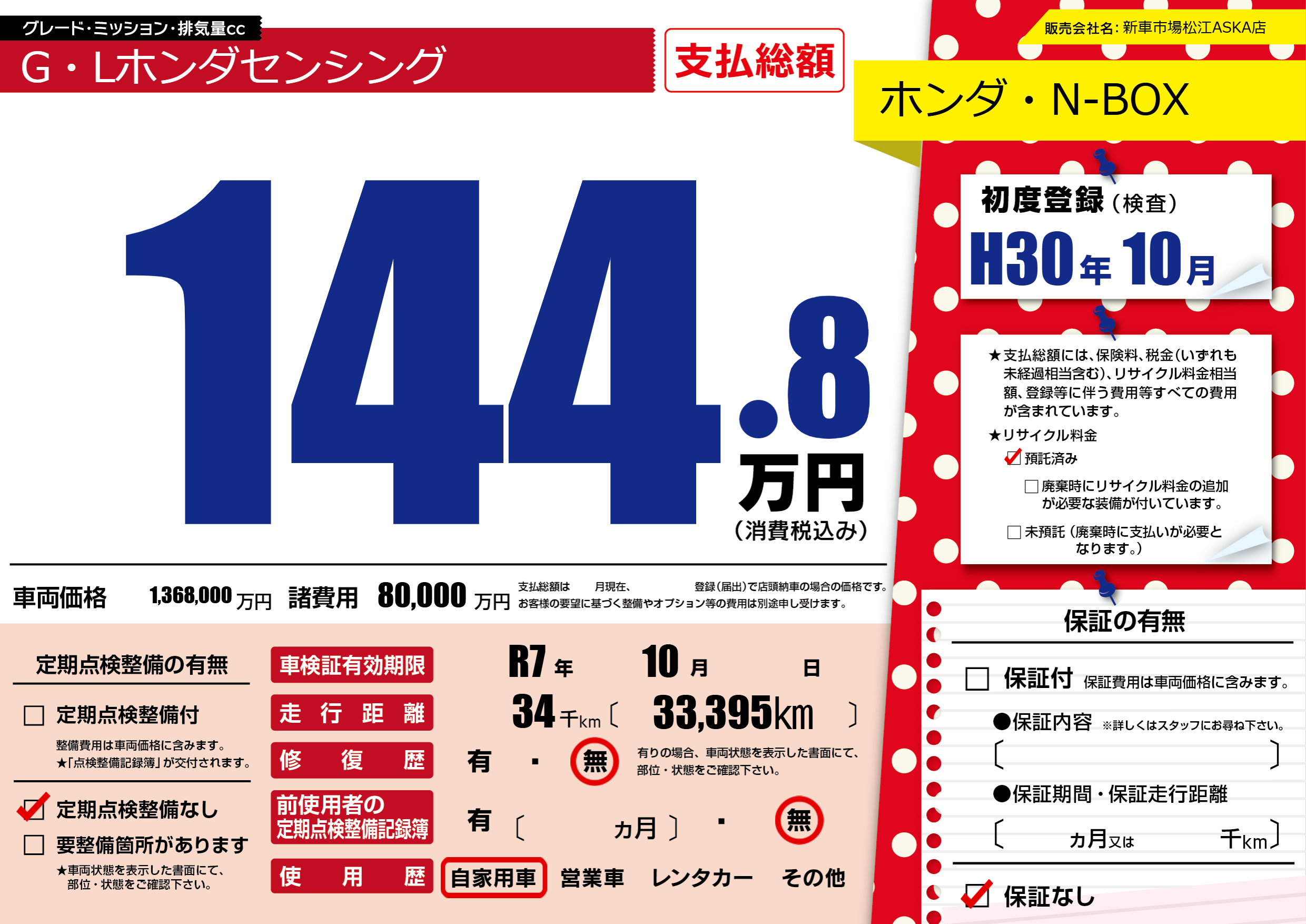 | 走行キロ | 3.4万km | 初年度登録 | H30年10月 |