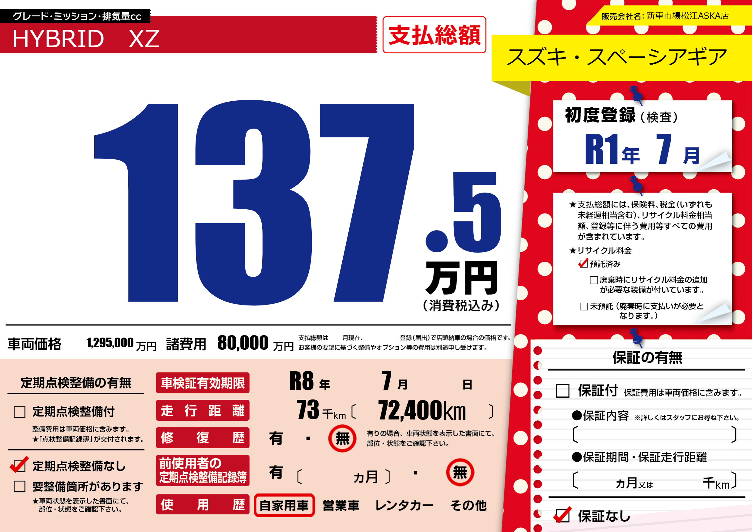 | 走行キロ | 7.3万km | 初年度登録 | R1年7月 |