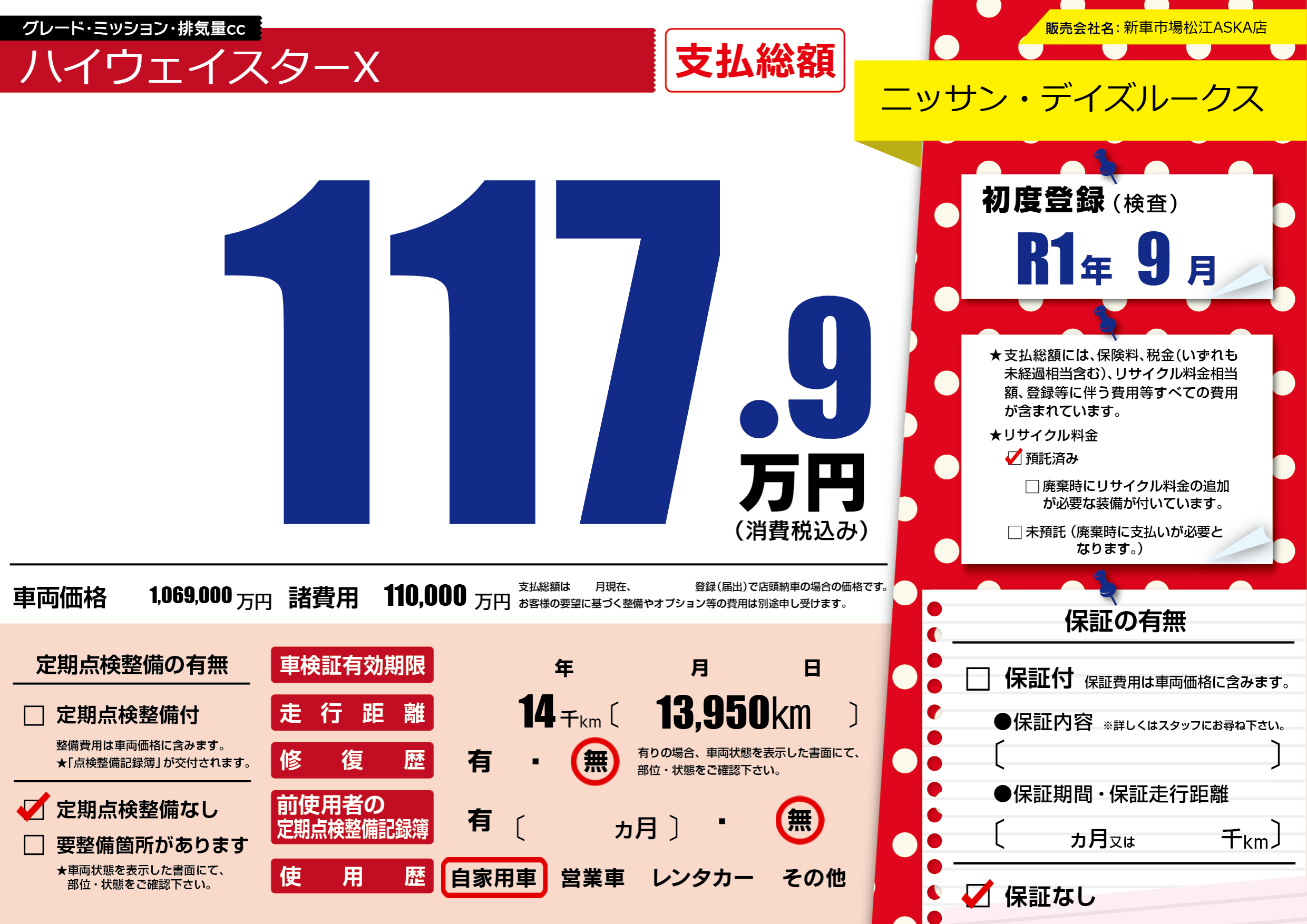 | 車名 | ニッサン・デイズルークス | グレード ミッション 排気量 |