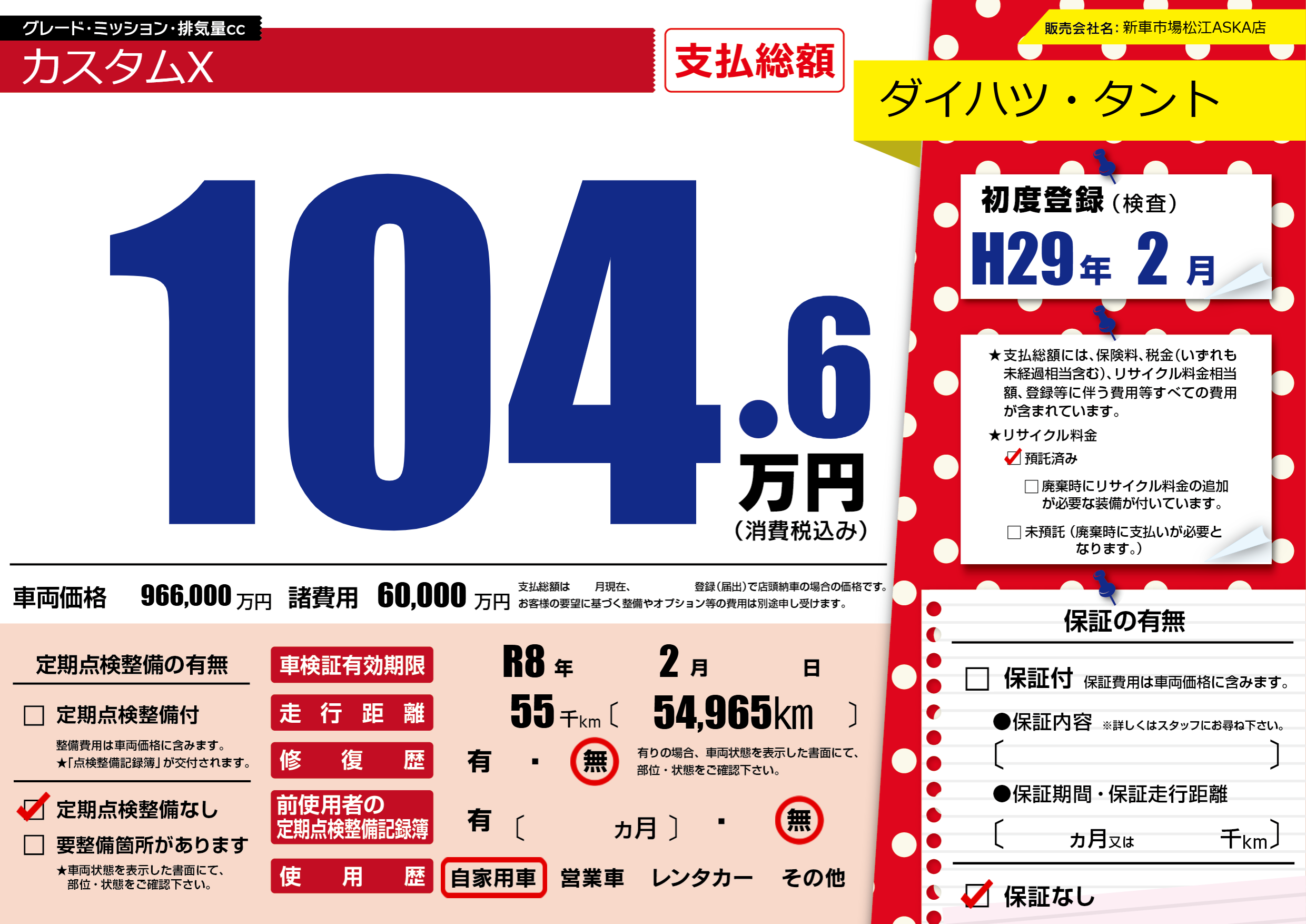 | 車名 | ダイハツ・タント | グレード ミッション 排気量 |