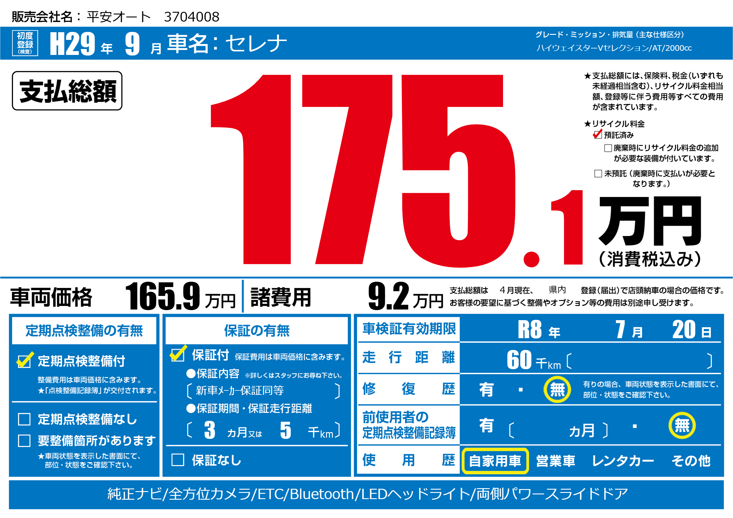 | 車名 | セレナ | グレード ミッション 排気量 |