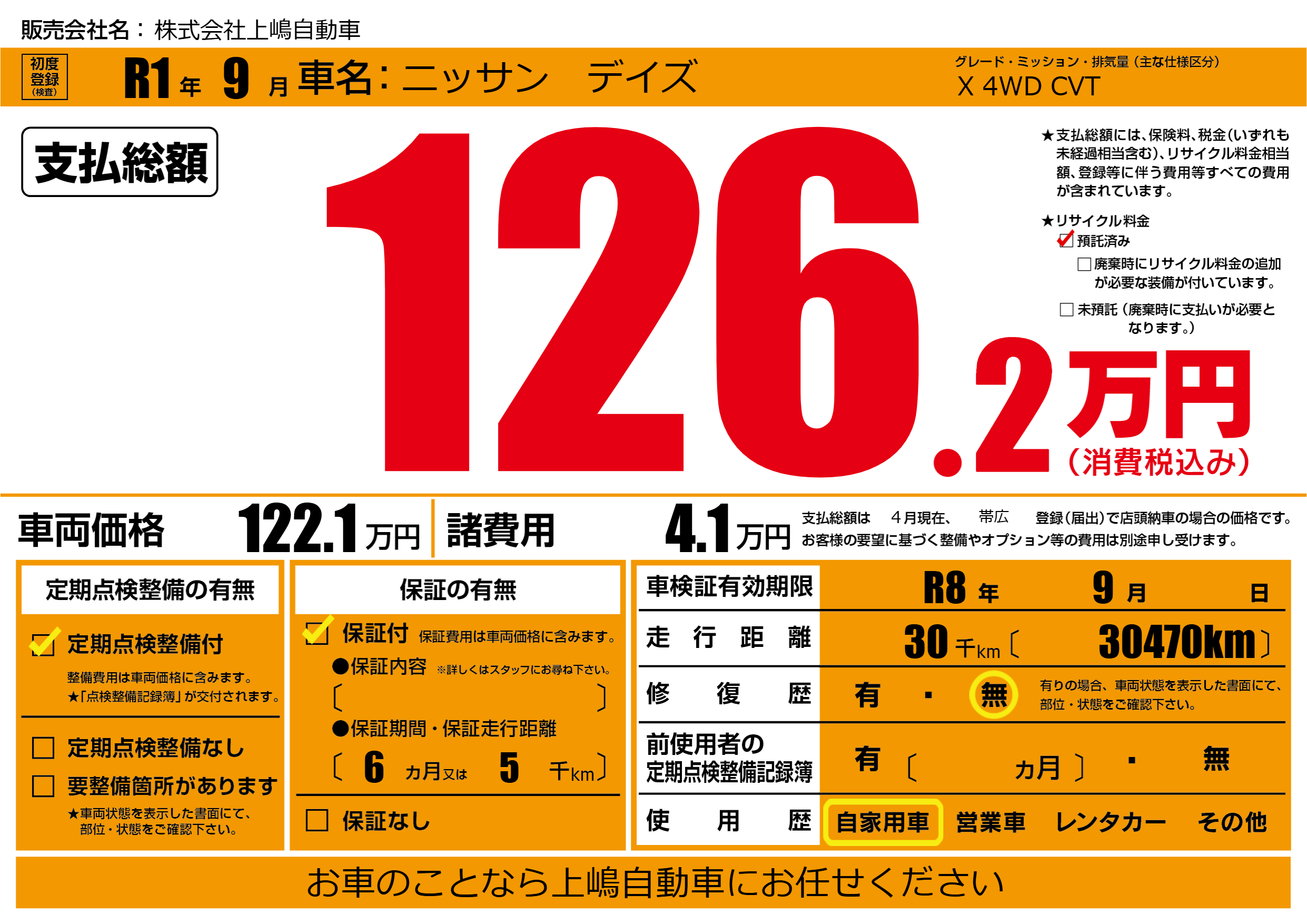 | 車名 | ニッサン デイズ | グレード ミッション 排気量 |