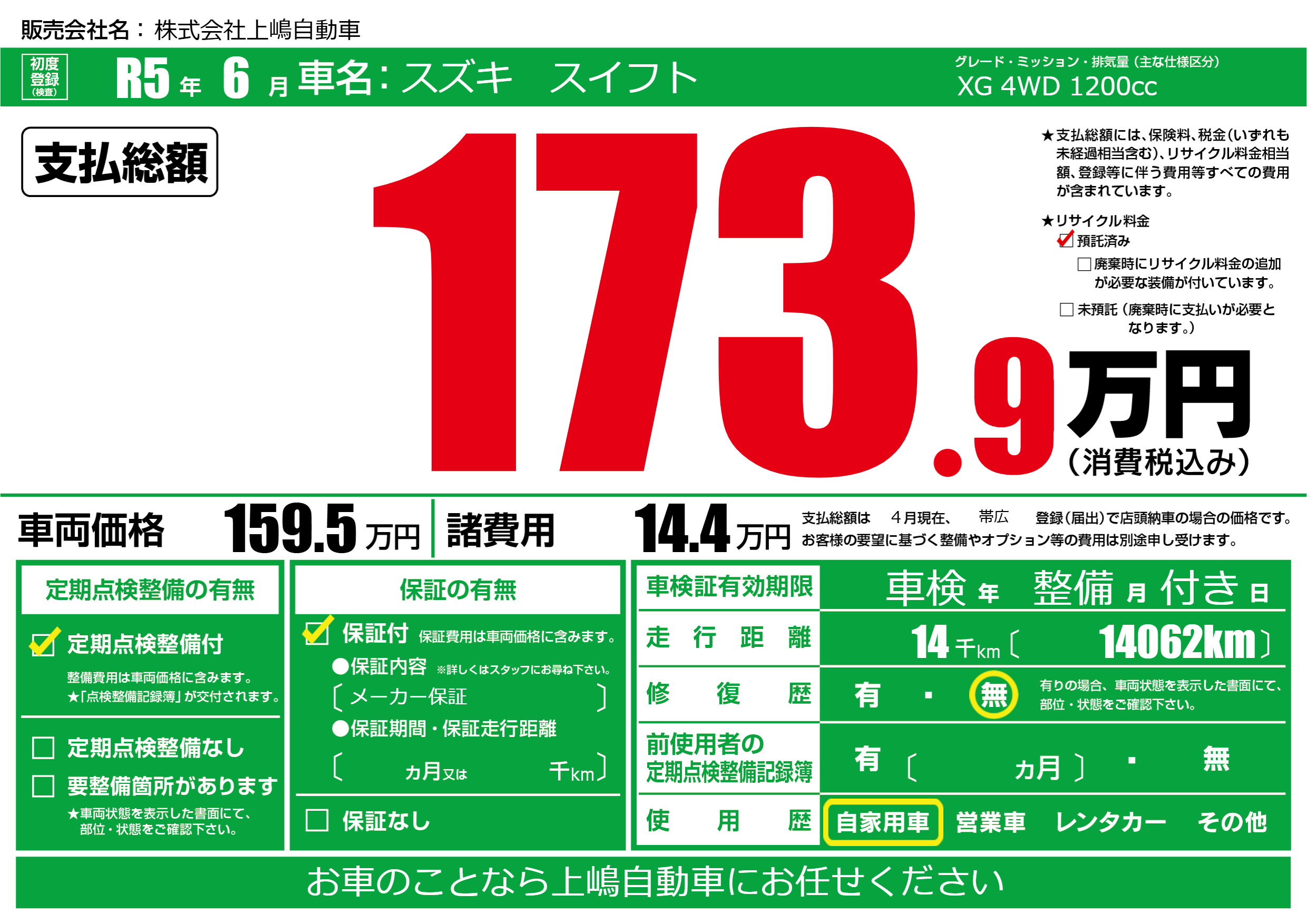 | 走行キロ | 1.4万km | 初年度登録 | R5年6月 |