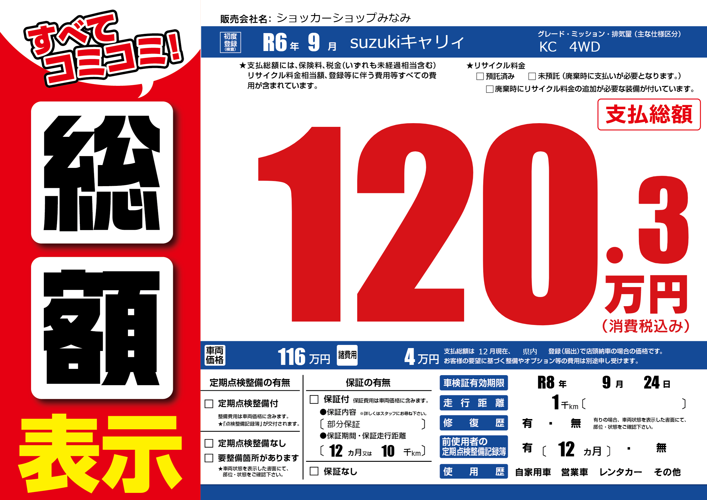 | 車名 | suzukiキャリィ | グレード ミッション 排気量 |