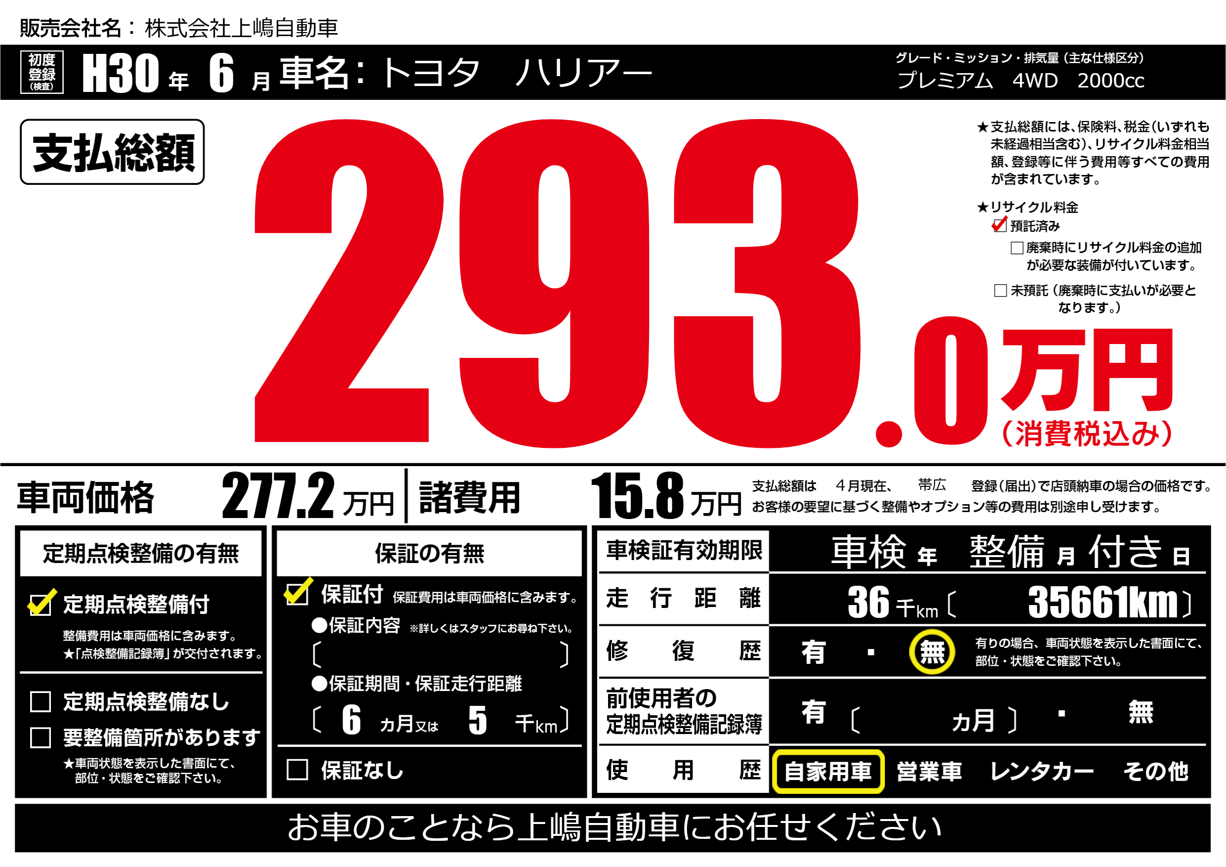| 車名 | トヨタ ハリアー | グレード ミッション 排気量 |