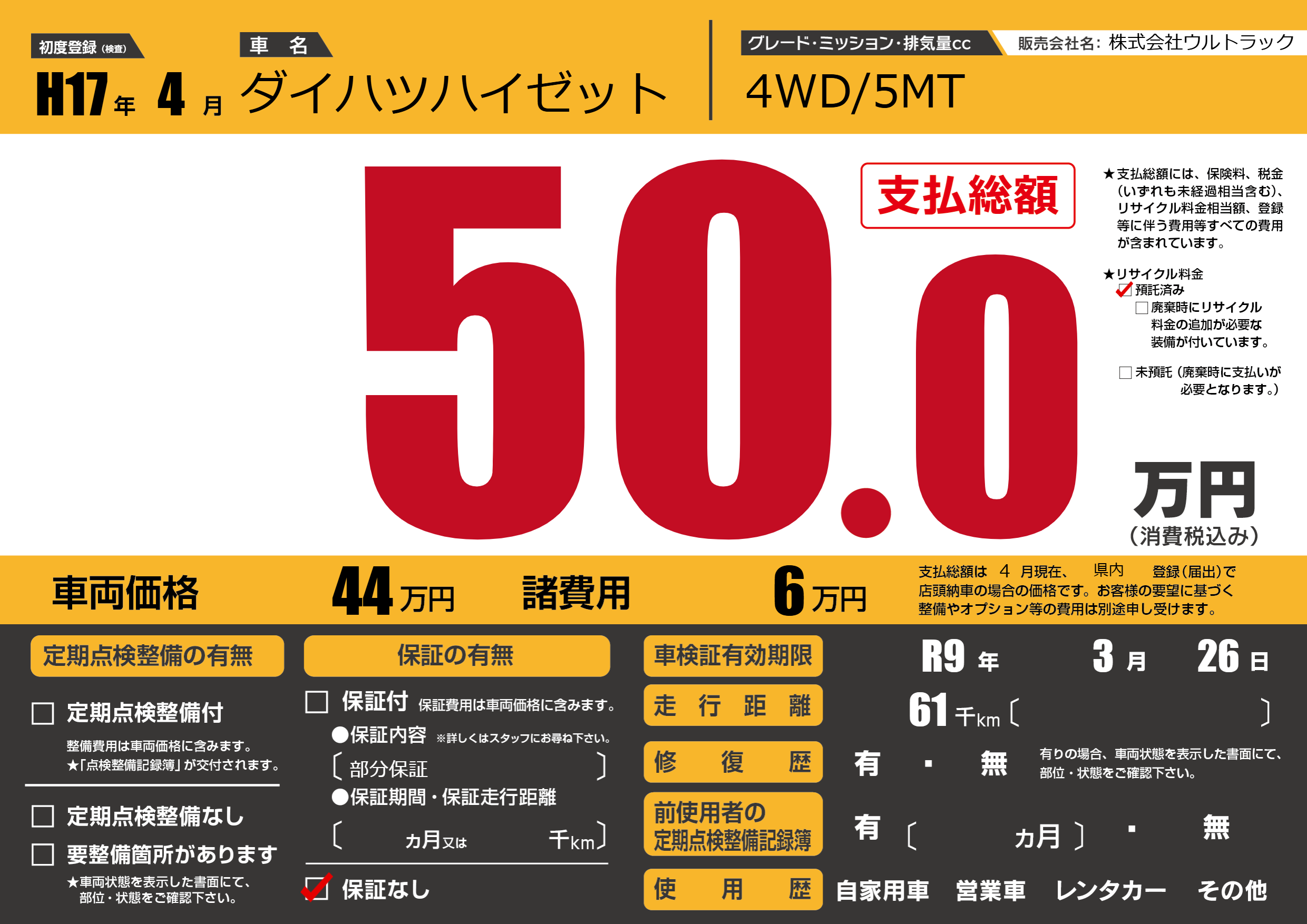 | 走行キロ | 6.1万km | 初年度登録 | H17年4月 |
