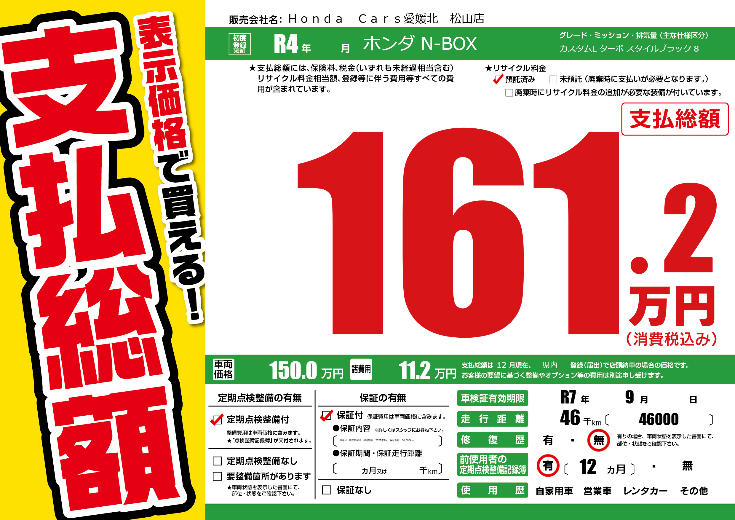 保証なし 保証内容(保証付:販売店保証 保証期限:2027年9月 保証距離:60,000km) ---ヶ月または()千kmまで |