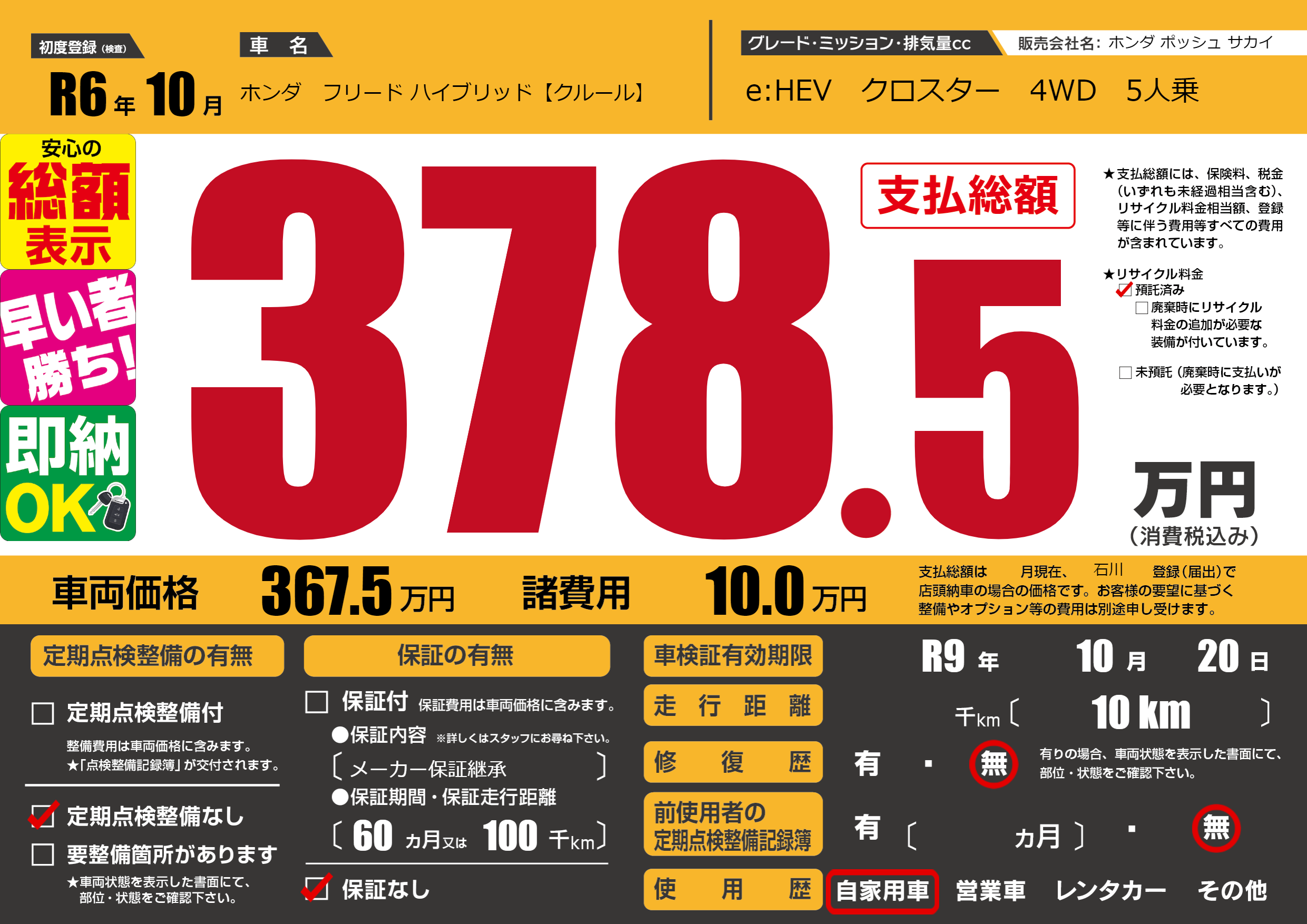 | 車名 | ホンダ フリード ハイブリッド【クルール】 | グレード ミッション 排気量 |