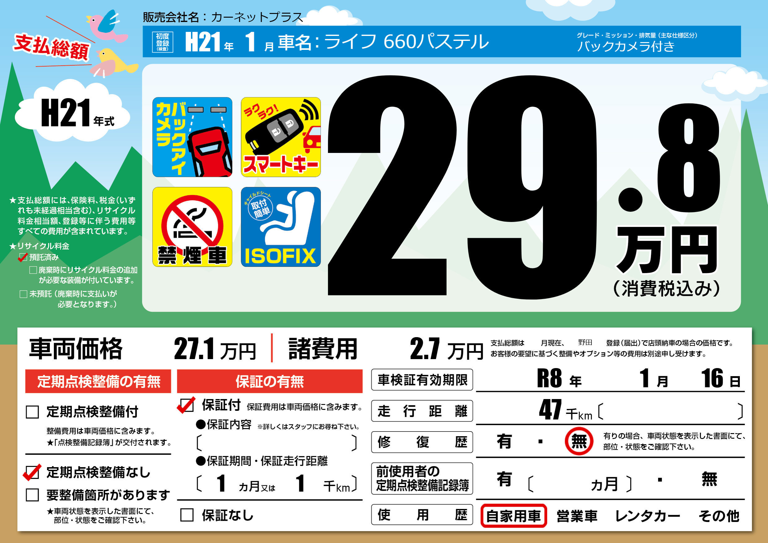 | 車名 | ライフ 660パステル | グレード ミッション 排気量 |