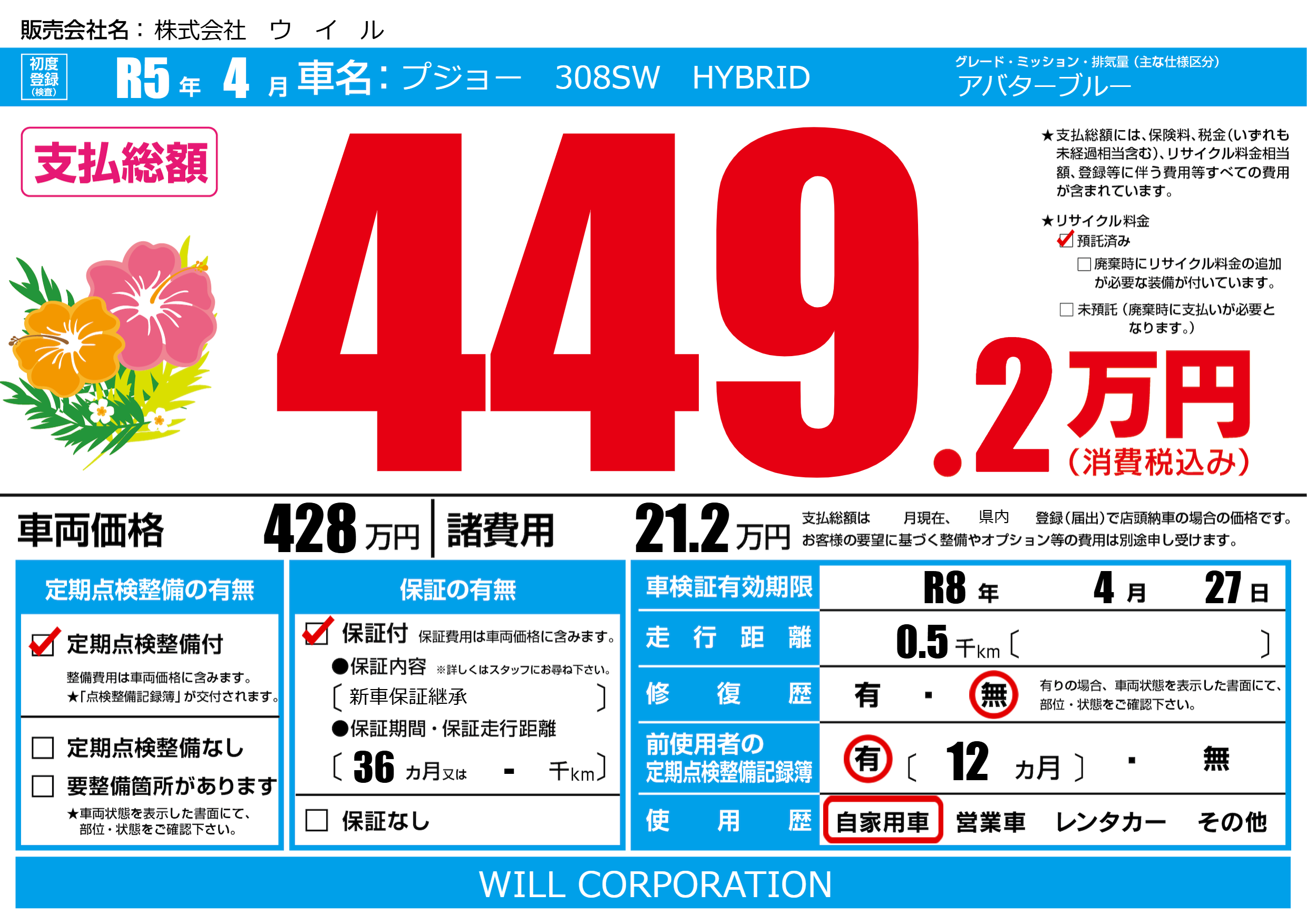 | 車名 | プジョー 308SW HYBRID | グレード ミッション 排気量 |