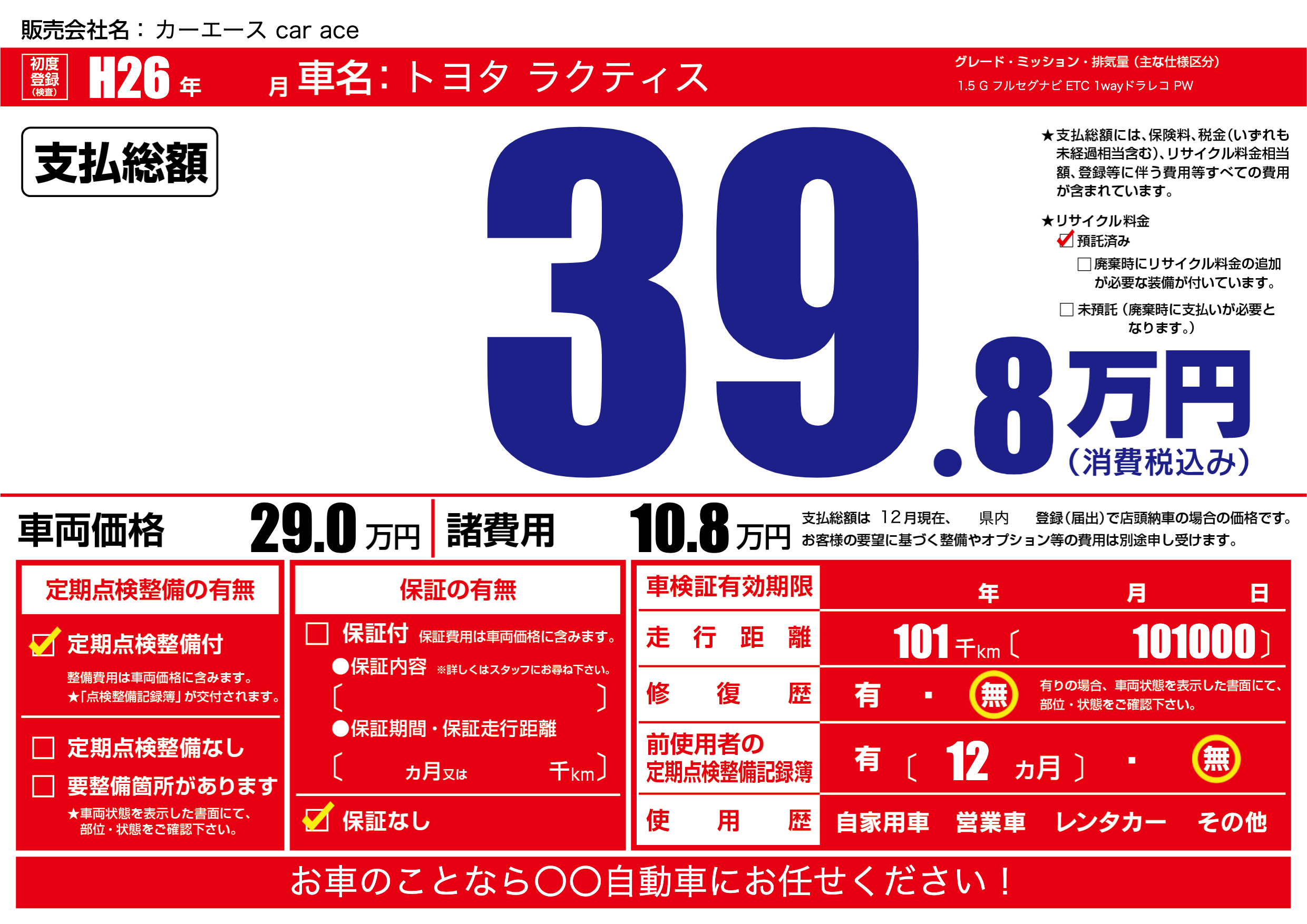 | 車名 | トヨタ ラクティス | グレード ミッション 排気量 |