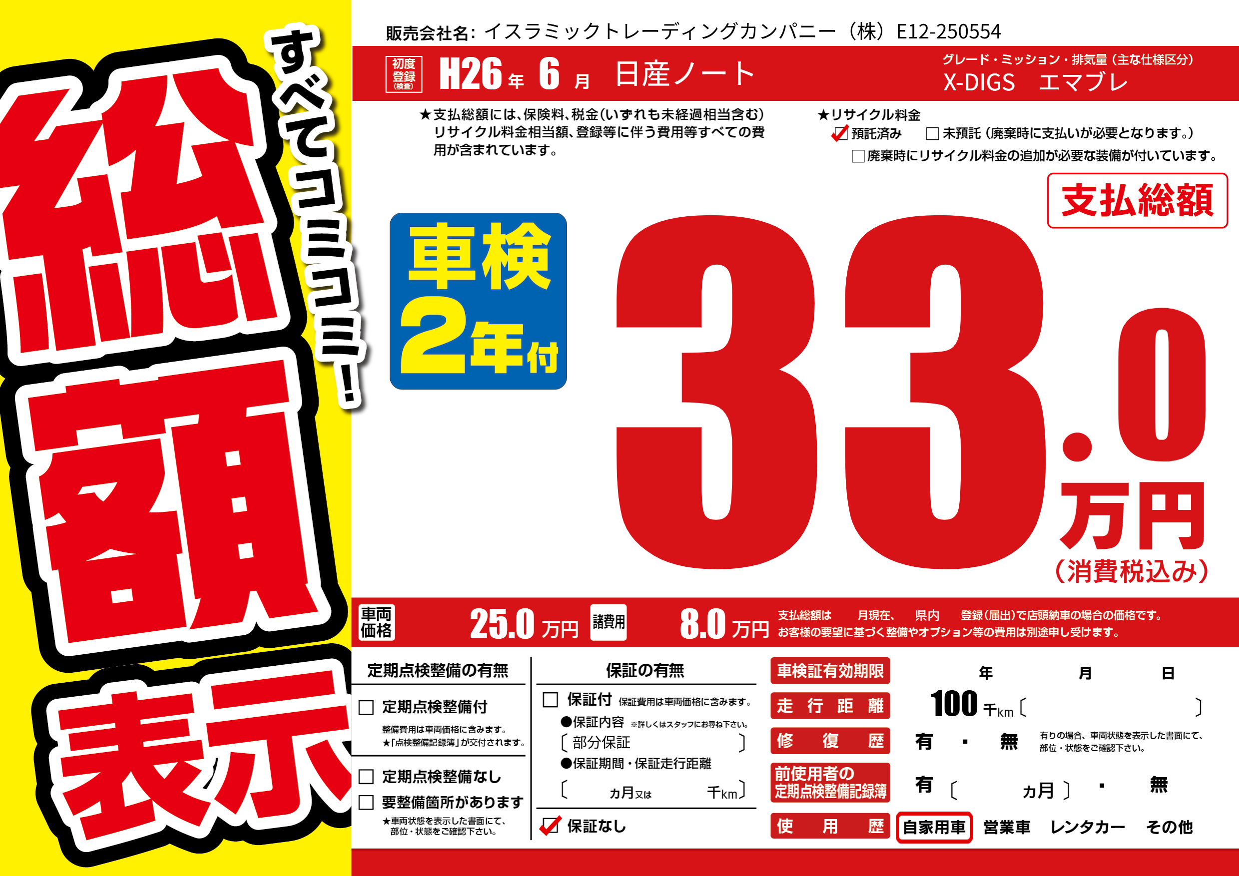 | 走行キロ | 10万km | 初年度登録 | H26年6月 |