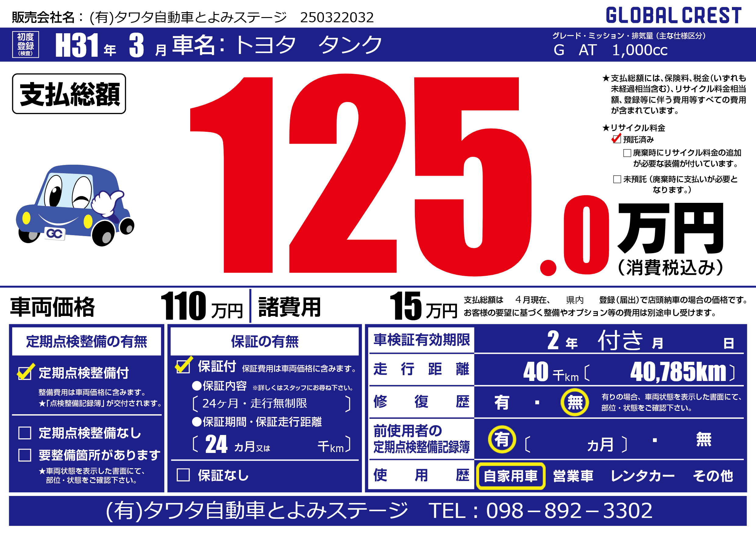 | 車名 | トヨタ タンク | グレード ミッション 排気量 |