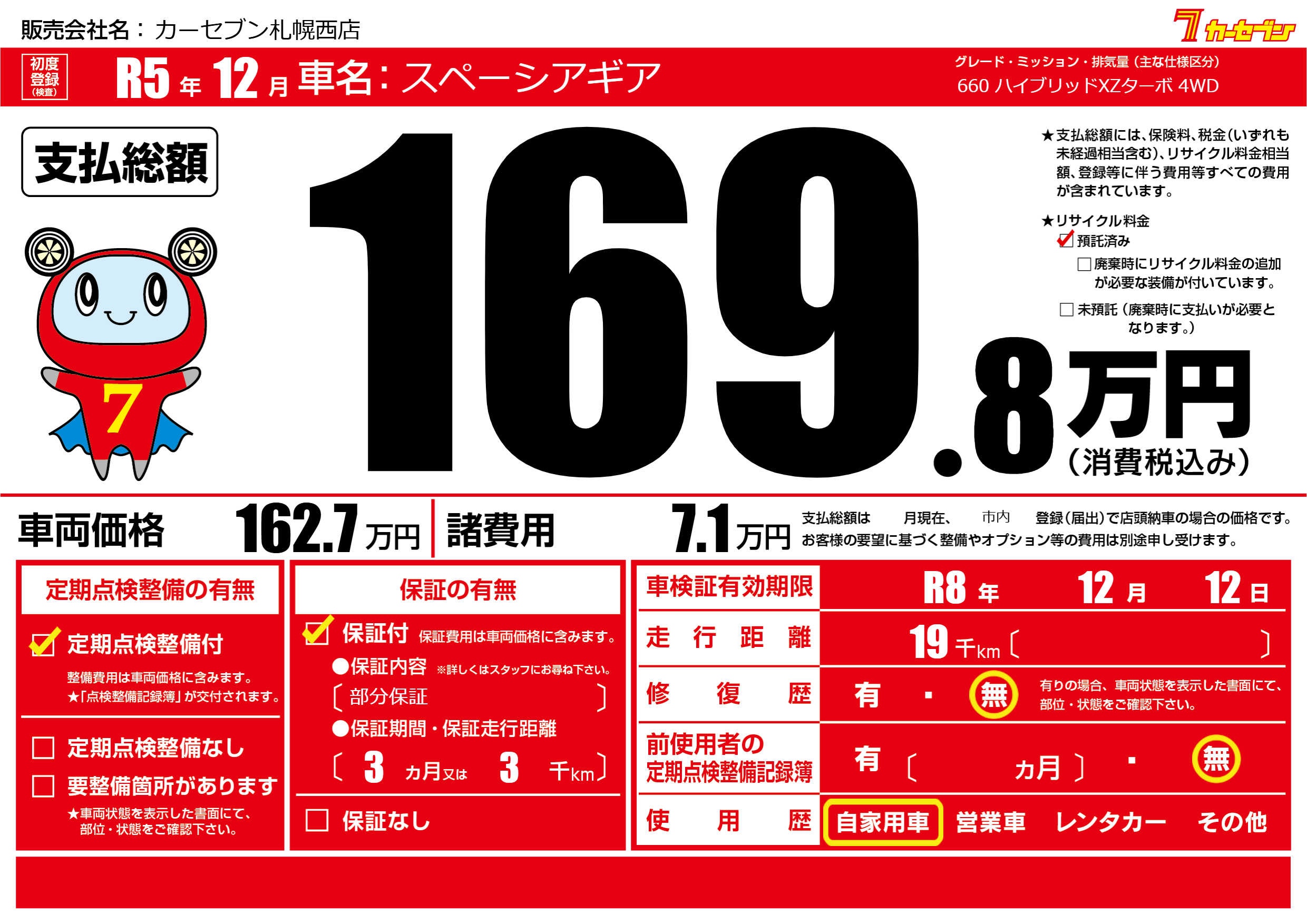 | 走行キロ | 1.9万km | 初年度登録 | R5年12月 |