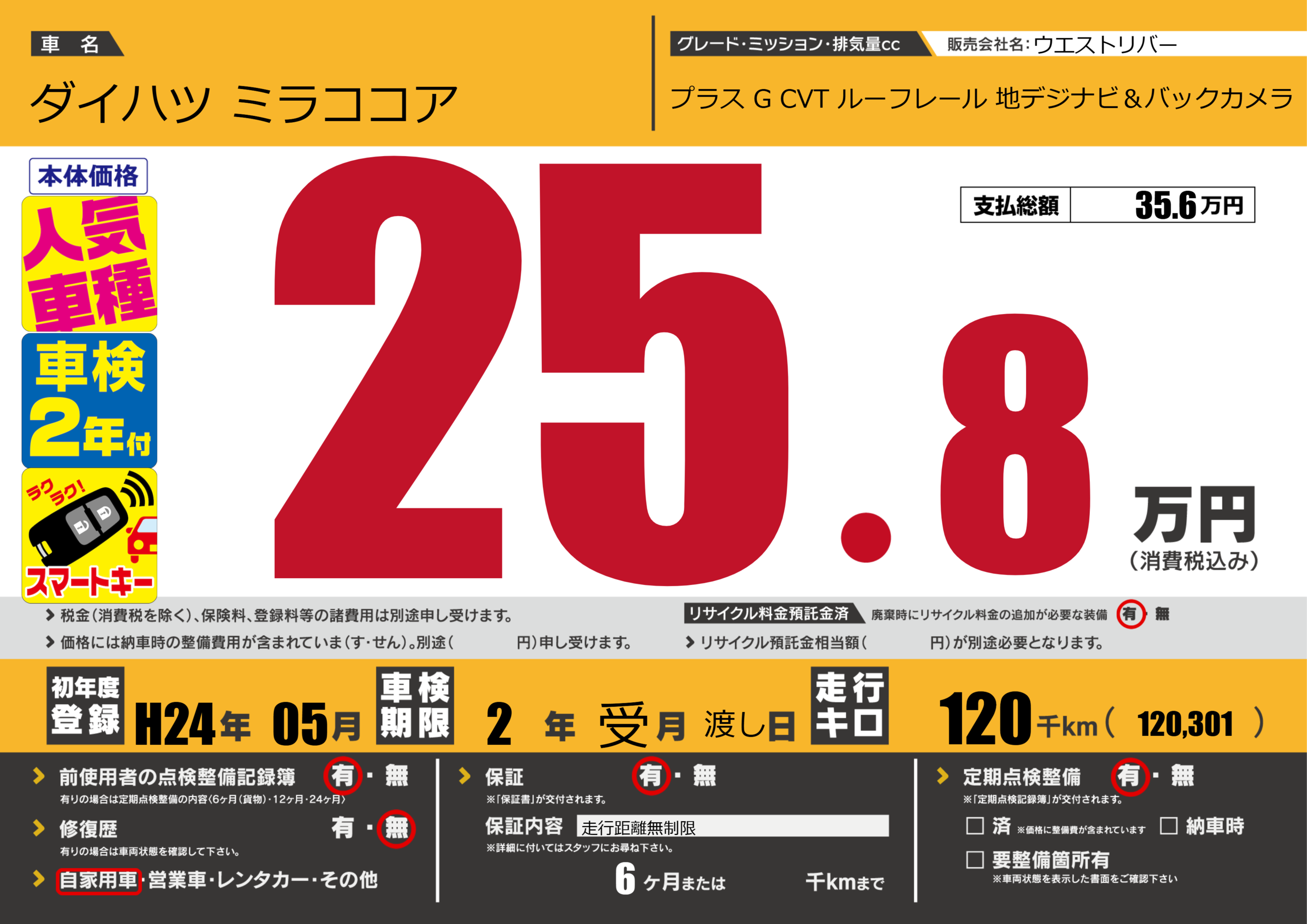 | 走行キロ | 12万km | 初年度登録 | H24年05月 |