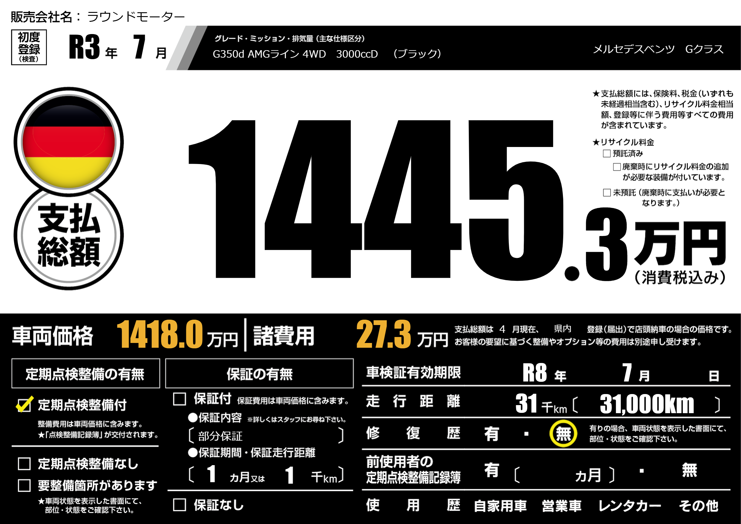 | 車名 | メルセデスベンツ Gクラス | グレード ミッション 排気量 |