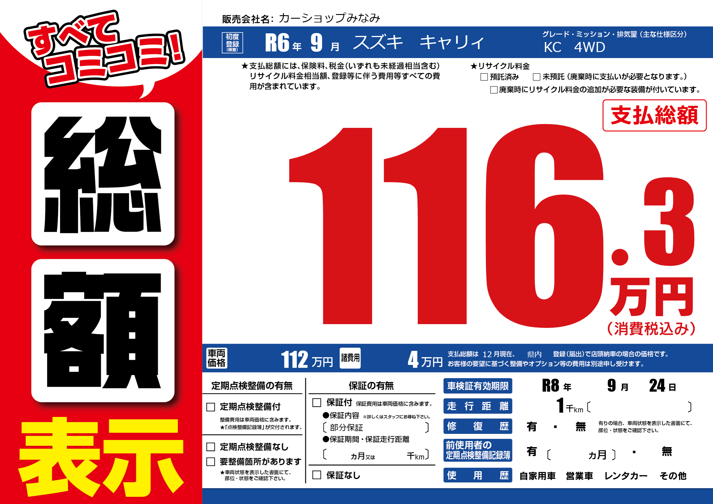 | 車名 | スズキ キャリィ | グレード ミッション 排気量 |