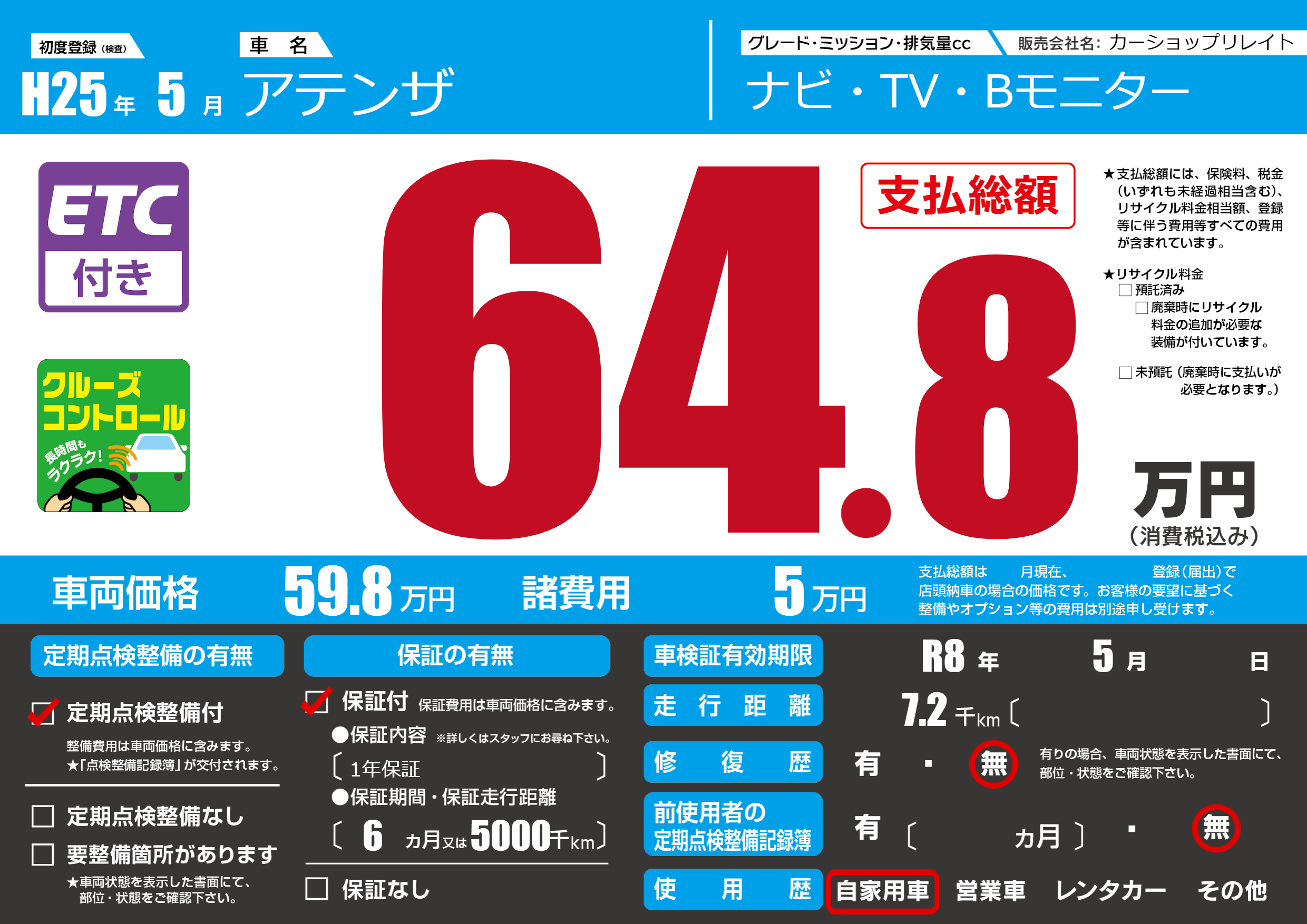 | 車検制限 | R8年 5月 - 日 | ||