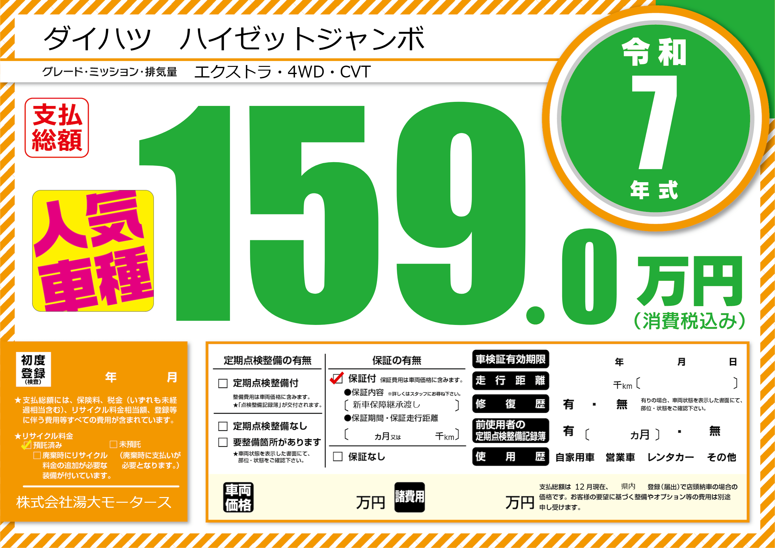 | 車名 | ダイハツ ハイゼットジャンボ | グレード ミッション 排気量 |
