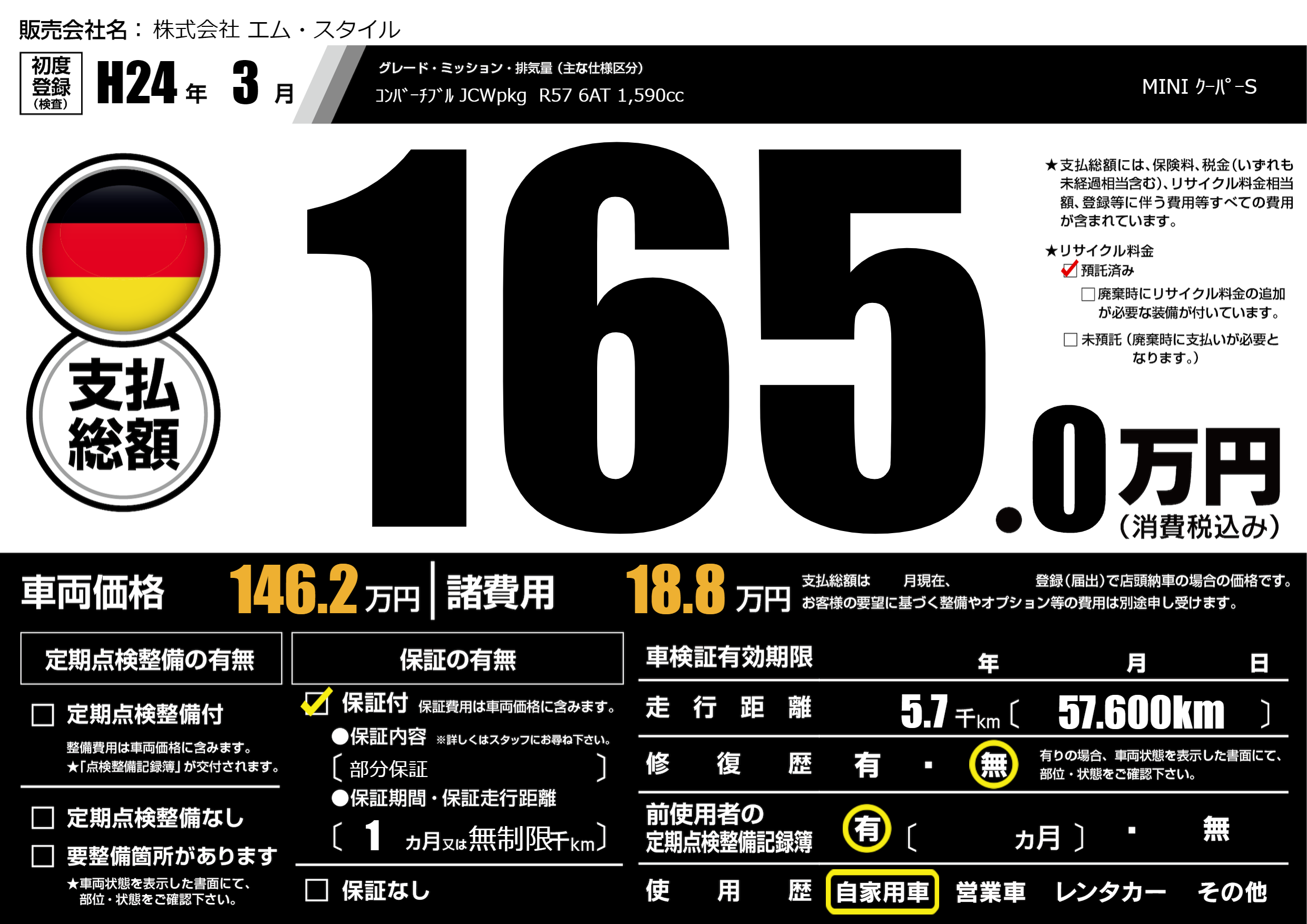 | 走行キロ | 0.5万km | 初年度登録 | H24年3月 |