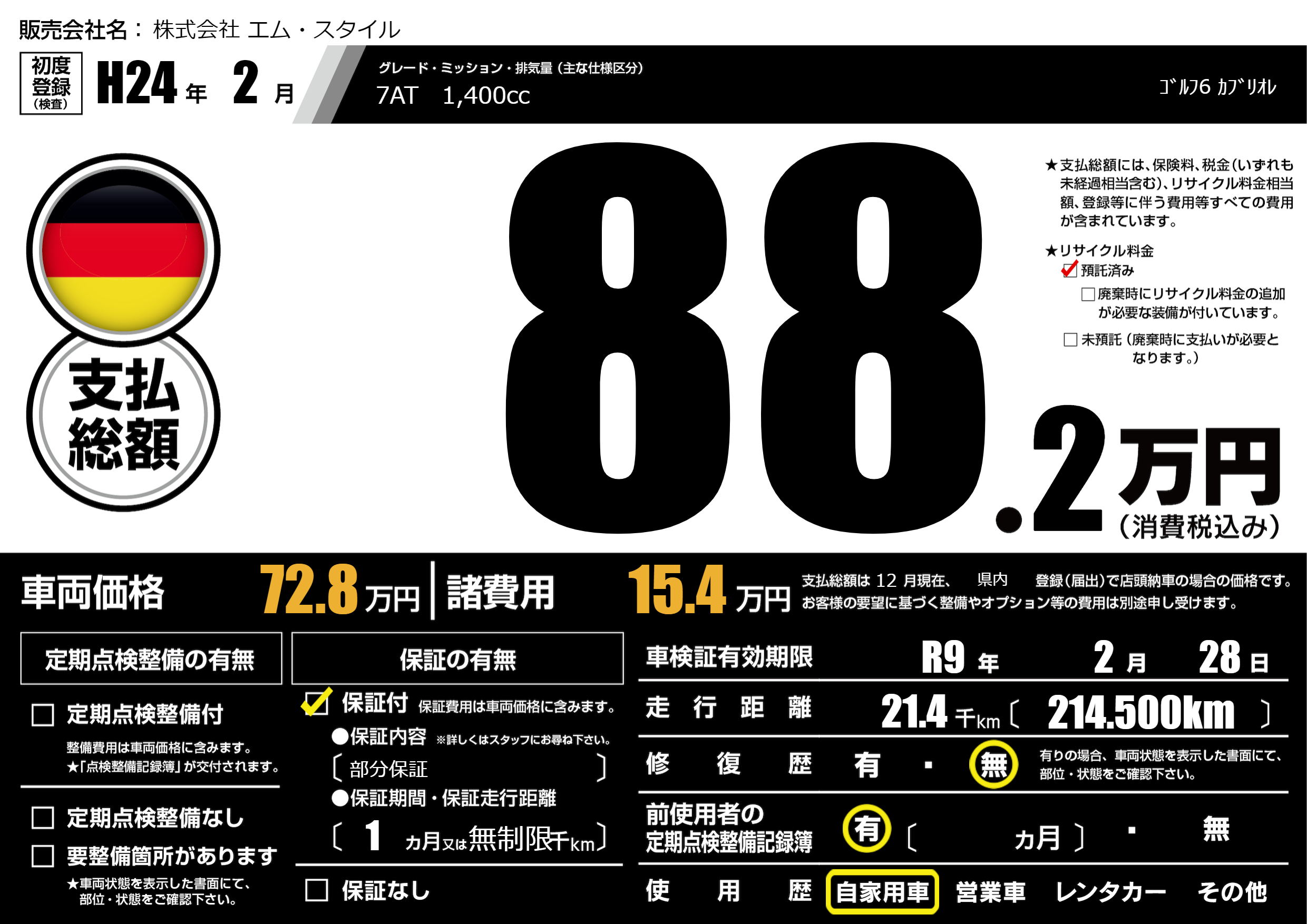 | 車名 | ゴルフ6 カブリオレ | グレード ミッション 排気量 |