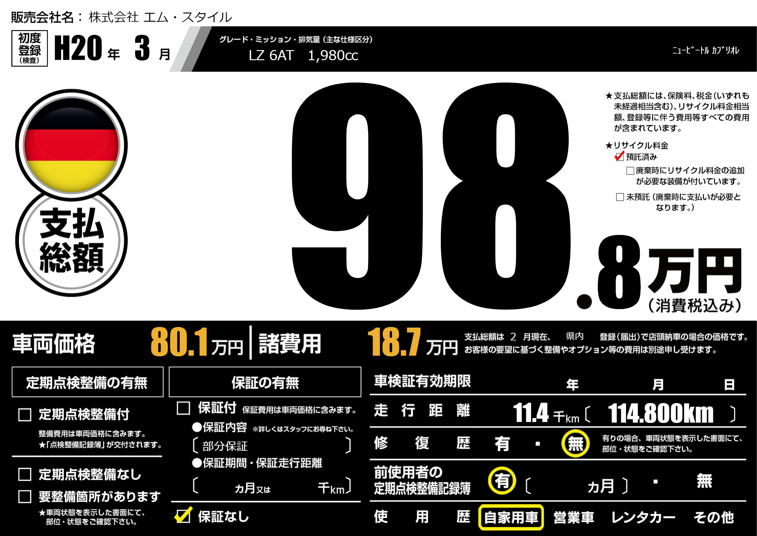 | 走行キロ | 1.1万km | 初年度登録 | H20年3月 |
