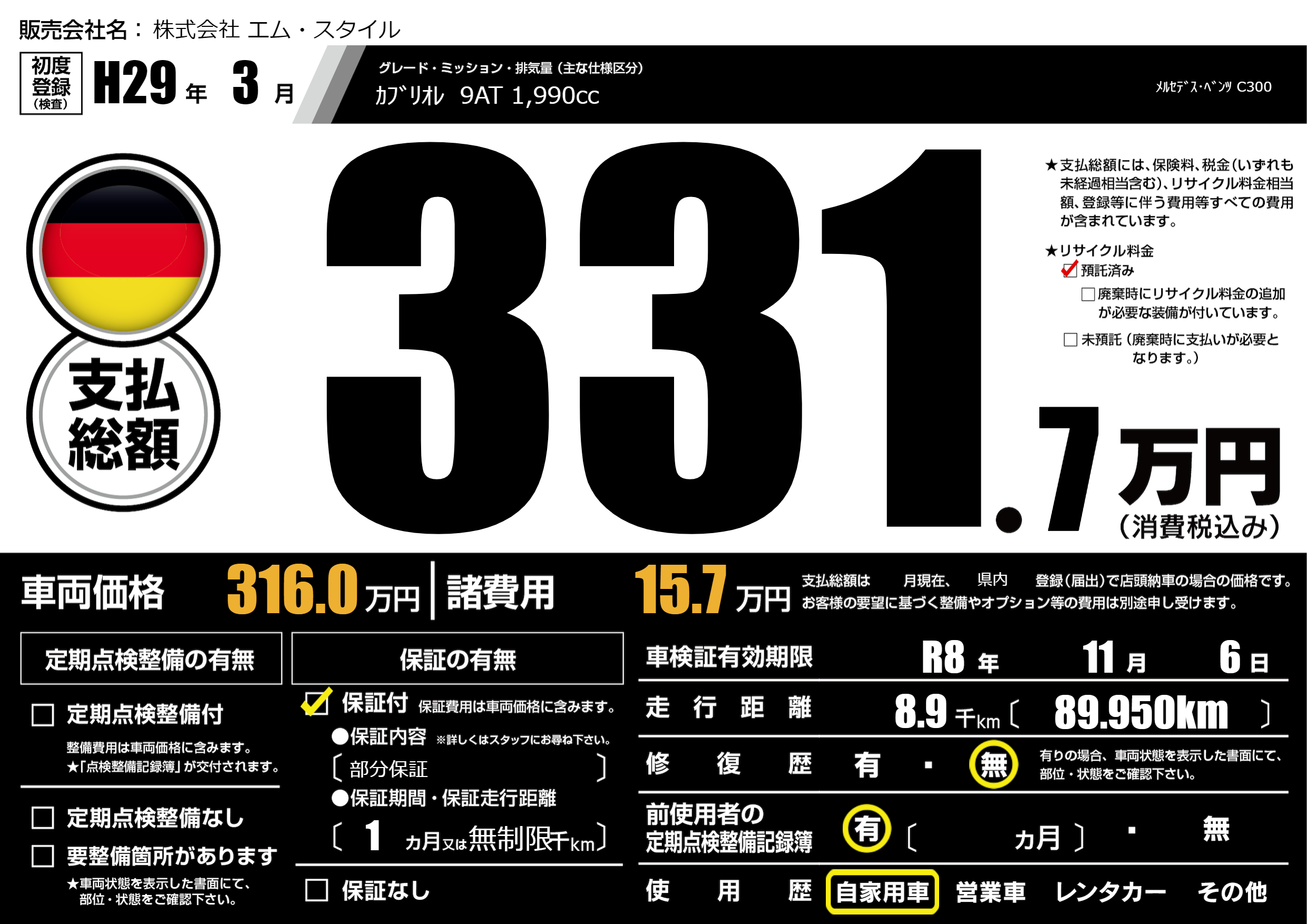 | 車名 | メルセデス・ベンツ C300 | グレード ミッション 排気量 |