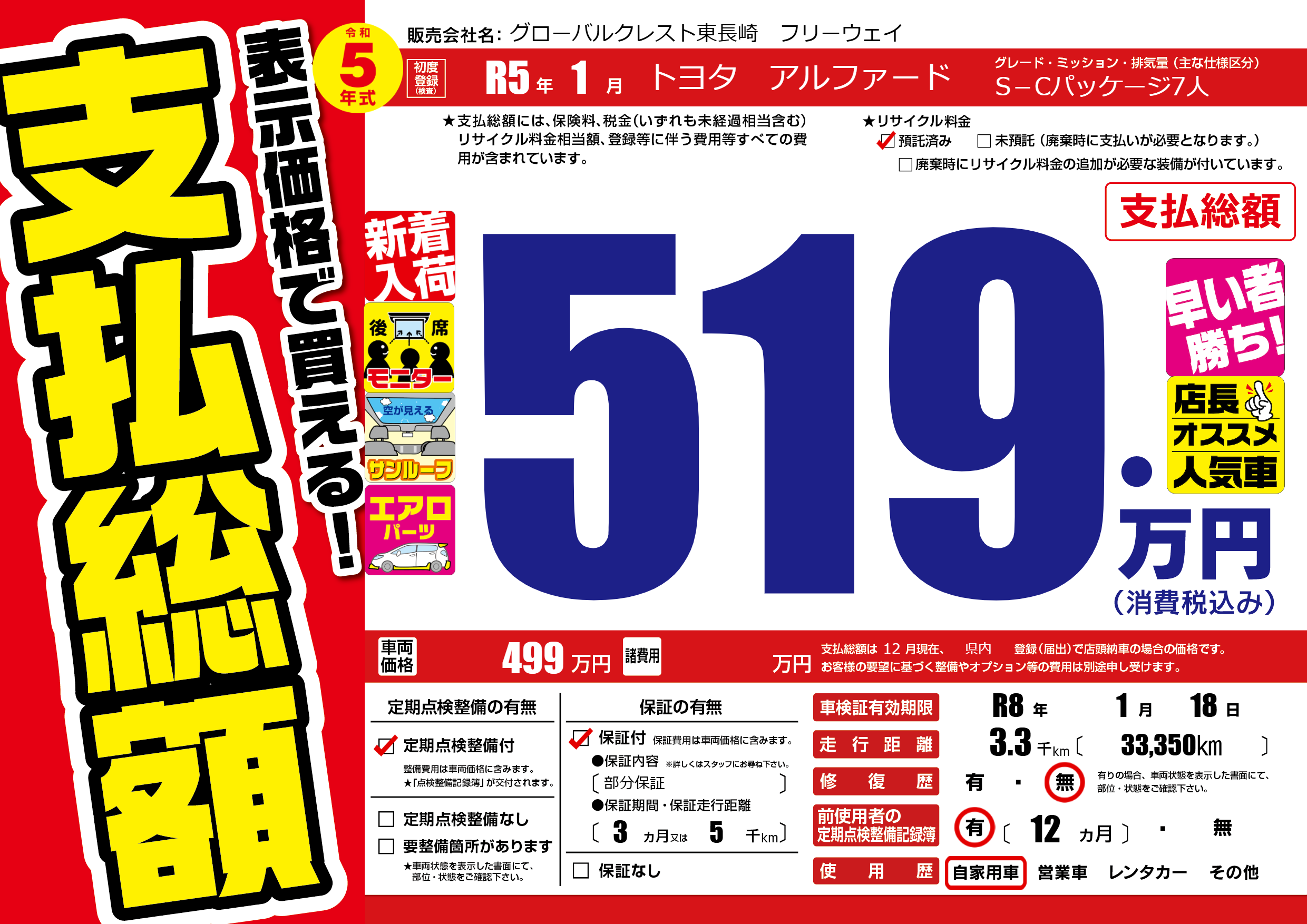 | 走行キロ | 0.3万km | 初年度登録 | R5年1月 |
