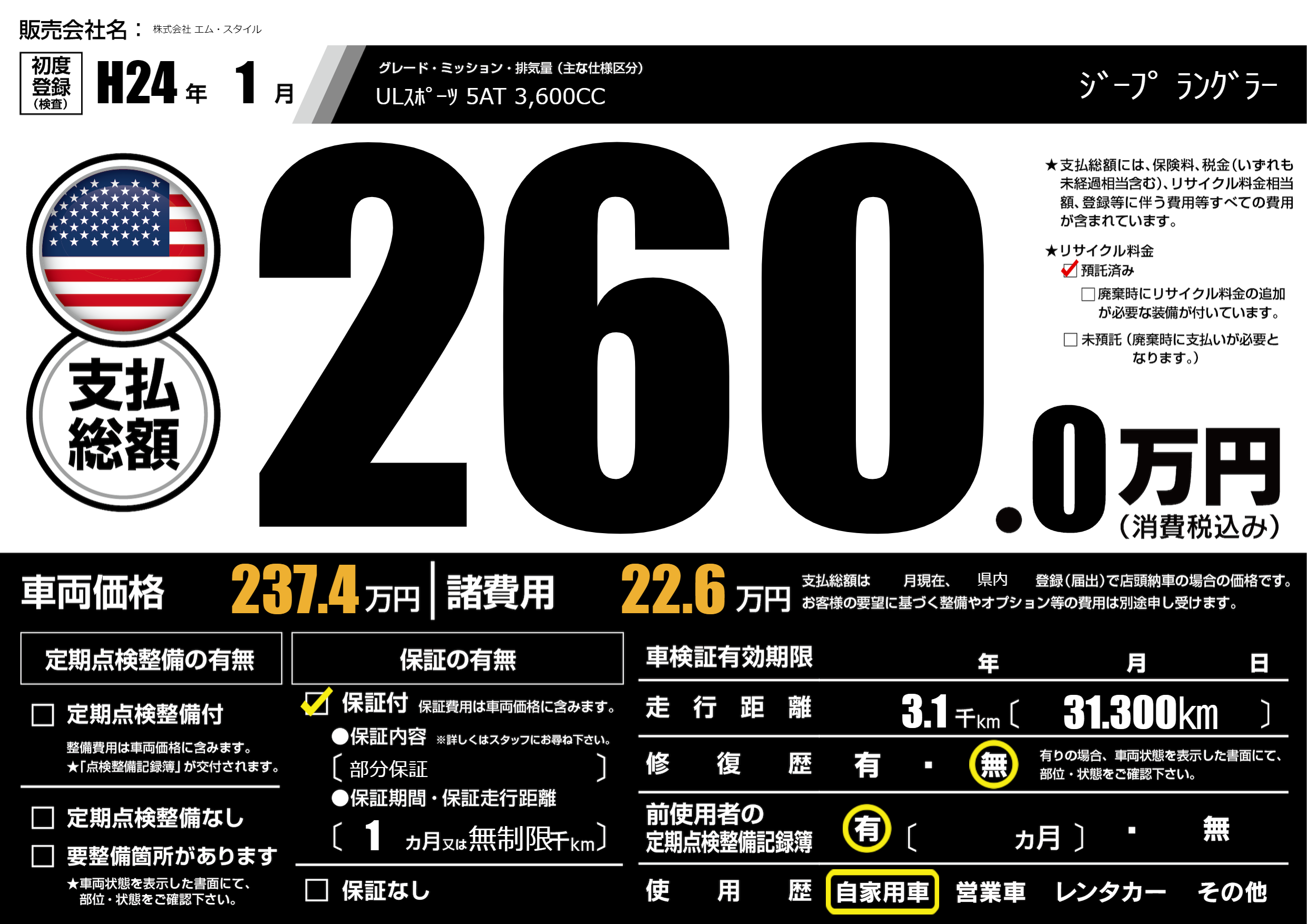 | 車名 | ジープ ラングラー | グレード ミッション 排気量 |