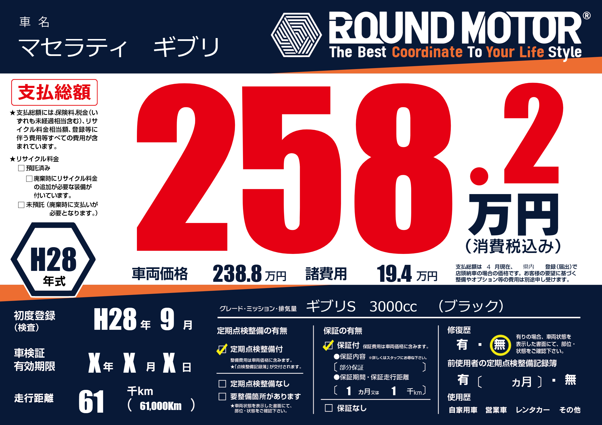 | 車名 | マセラティ ギブリ | グレード ミッション 排気量 |