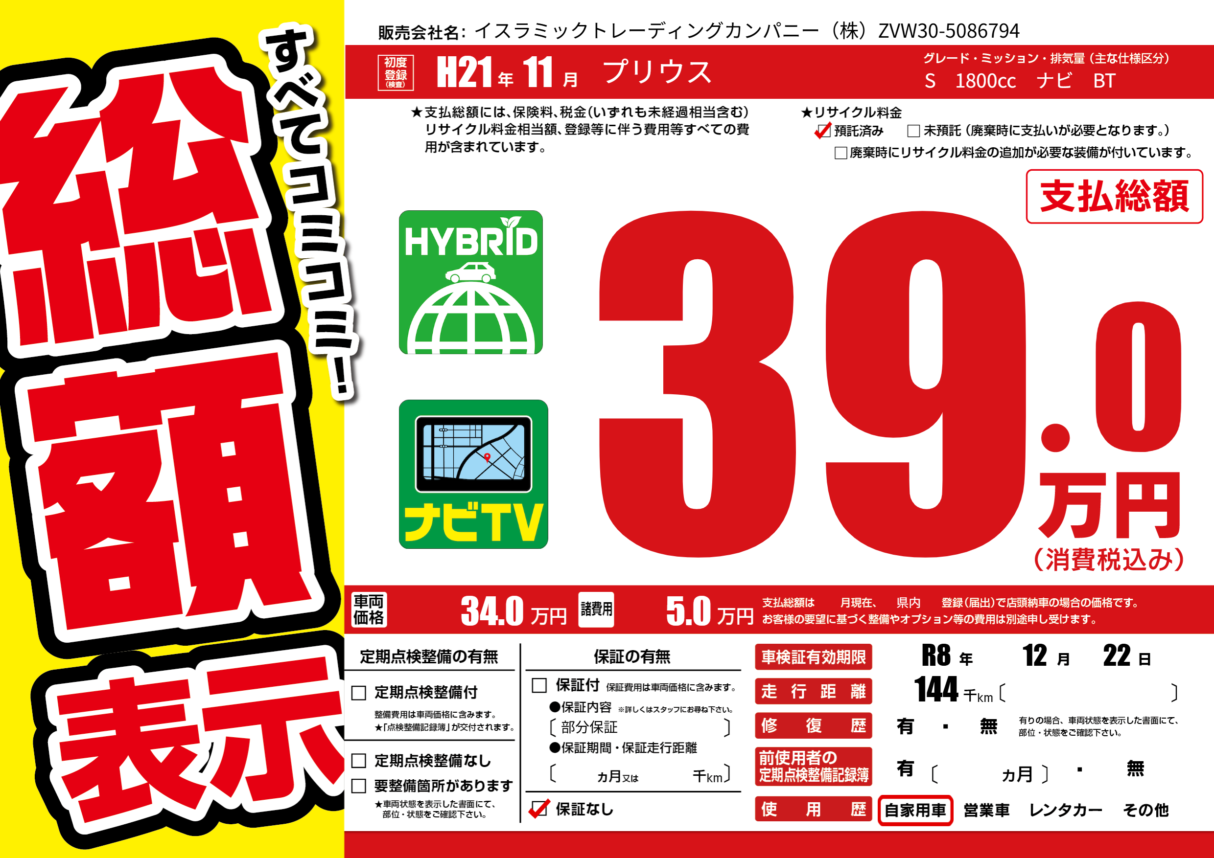 | 車名 | プリウス | グレード ミッション 排気量 |