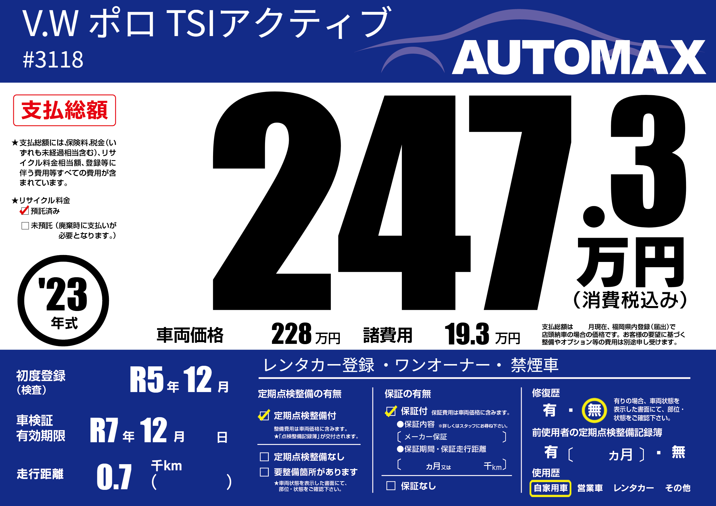 | 車名 | V.W ポロ TSIアクティブ | グレード ミッション 排気量 |