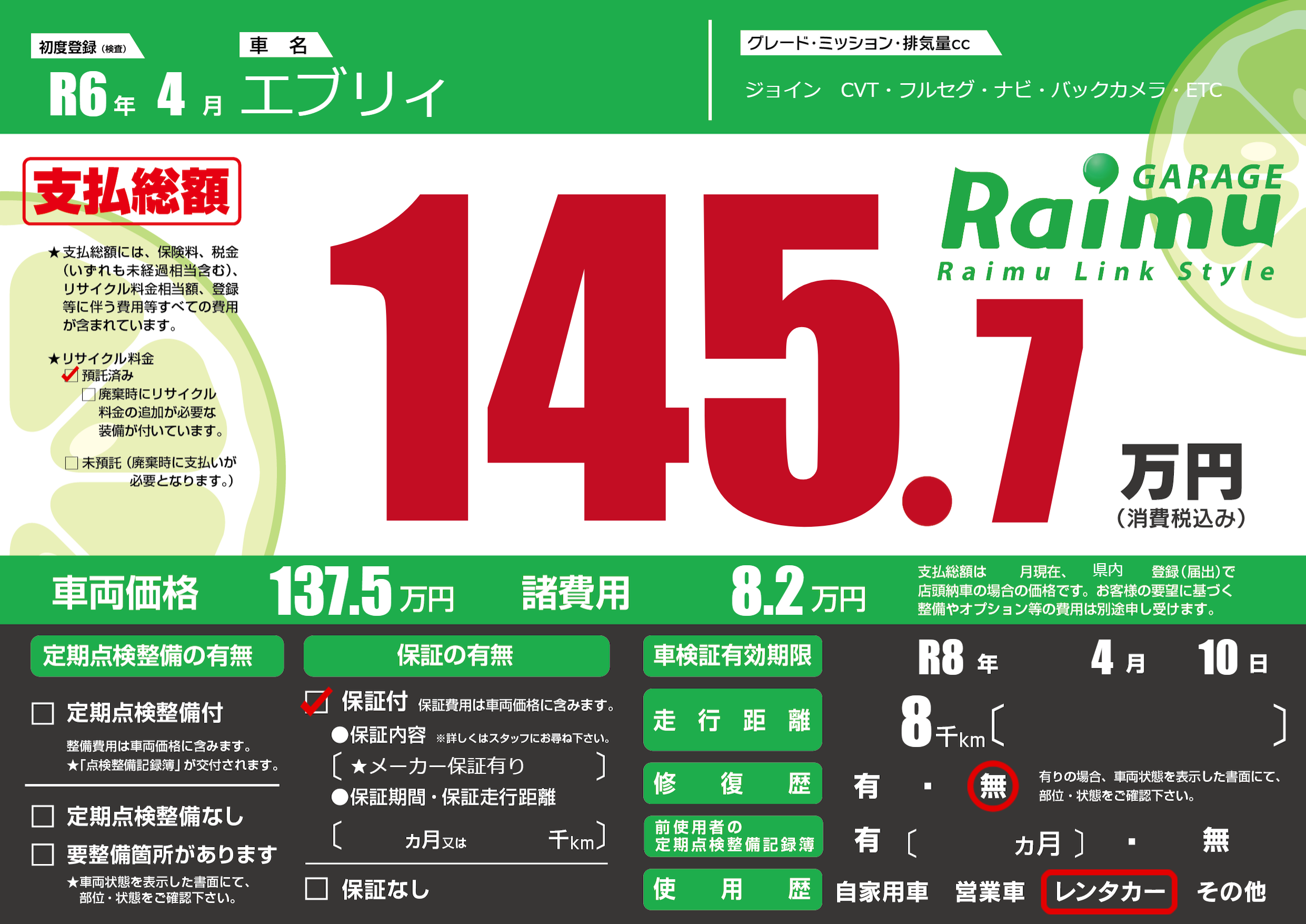 | 車検制限 | R8年 4月 10日 | ||