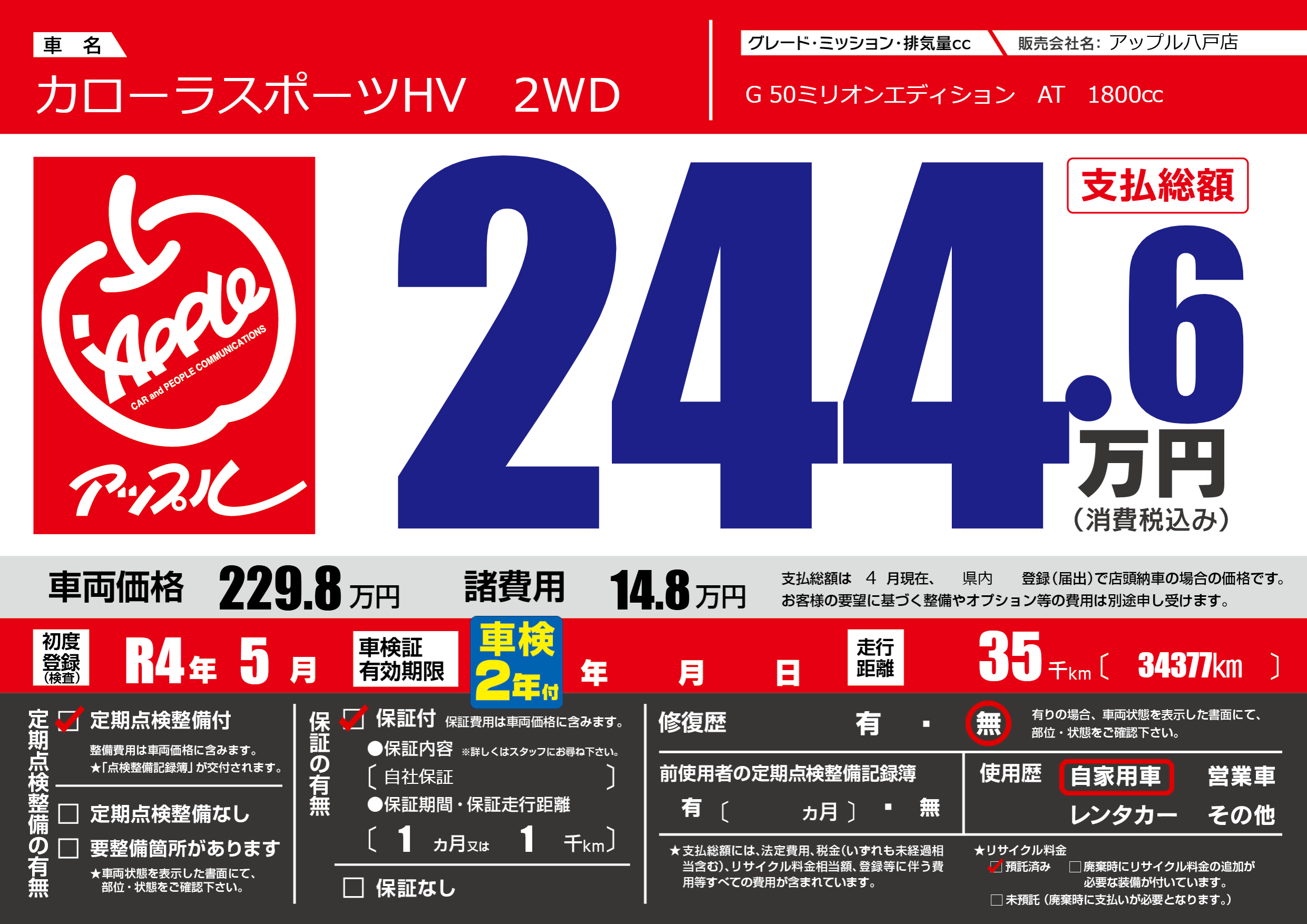| 車名 | カローラスポーツHV 2WD | グレード ミッション 排気量 |
