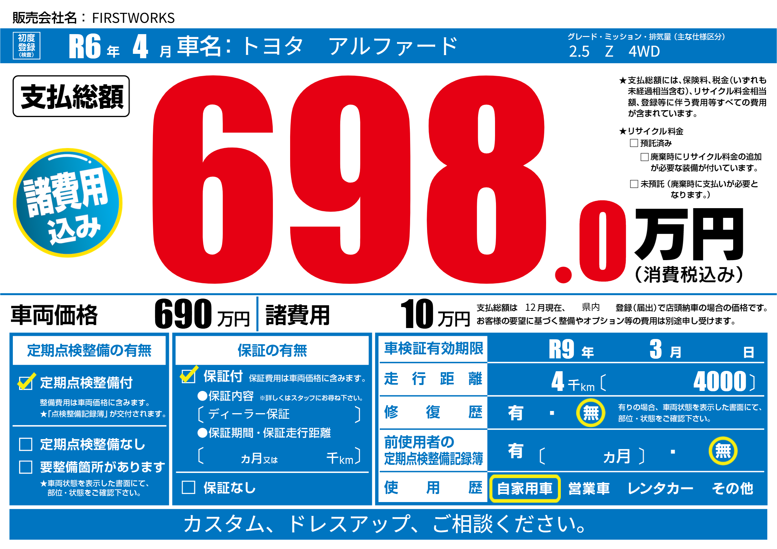 | 車検制限 | R9年 3月 - 日 | ||