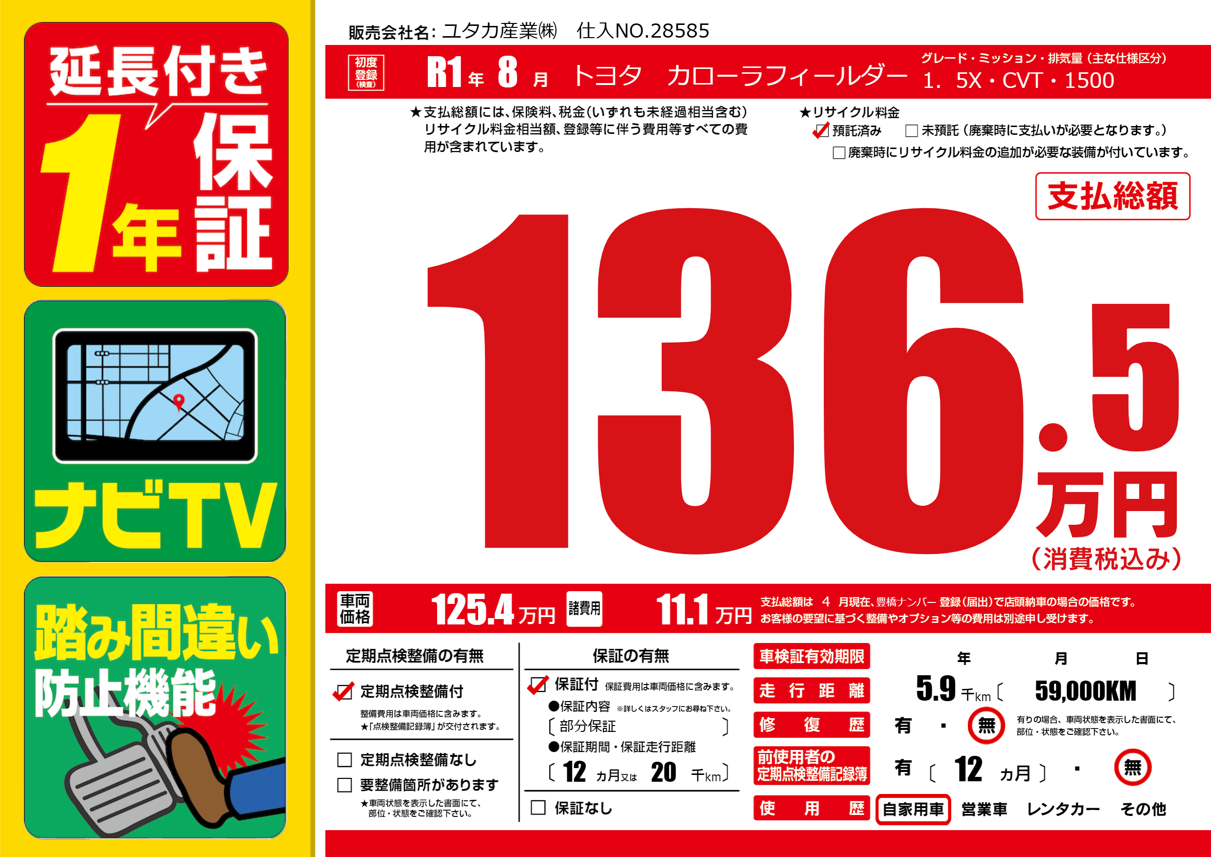 | 走行キロ | 0.5万km | 初年度登録 | R1年8月 |