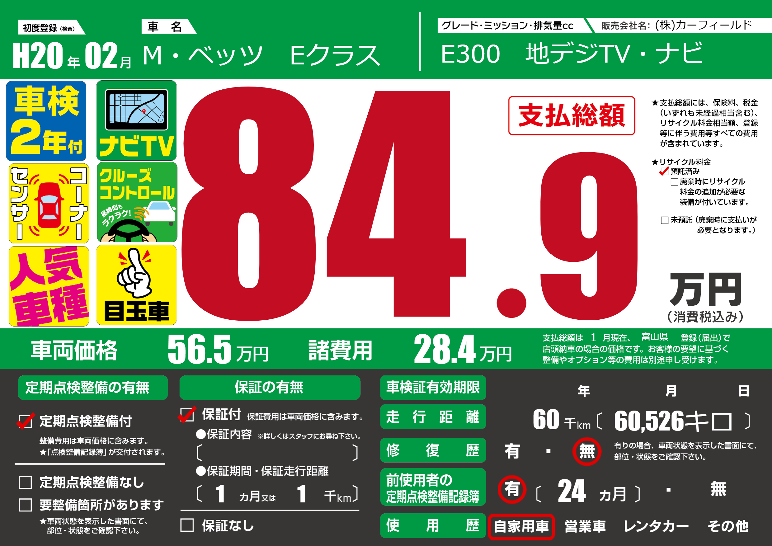 | 走行キロ | 6万km | 初年度登録 | H20年02月 |