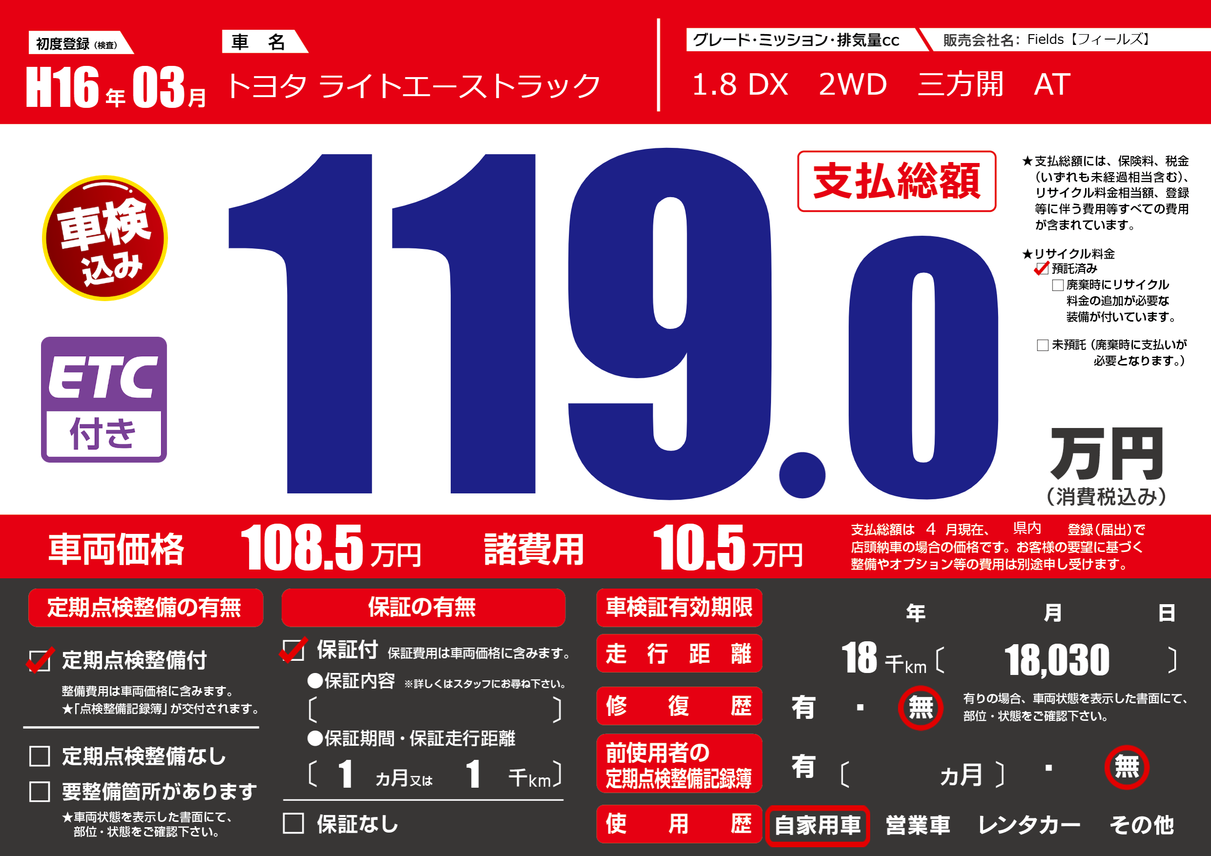 | 走行キロ | 1.8万km | 初年度登録 | H16年03月 |