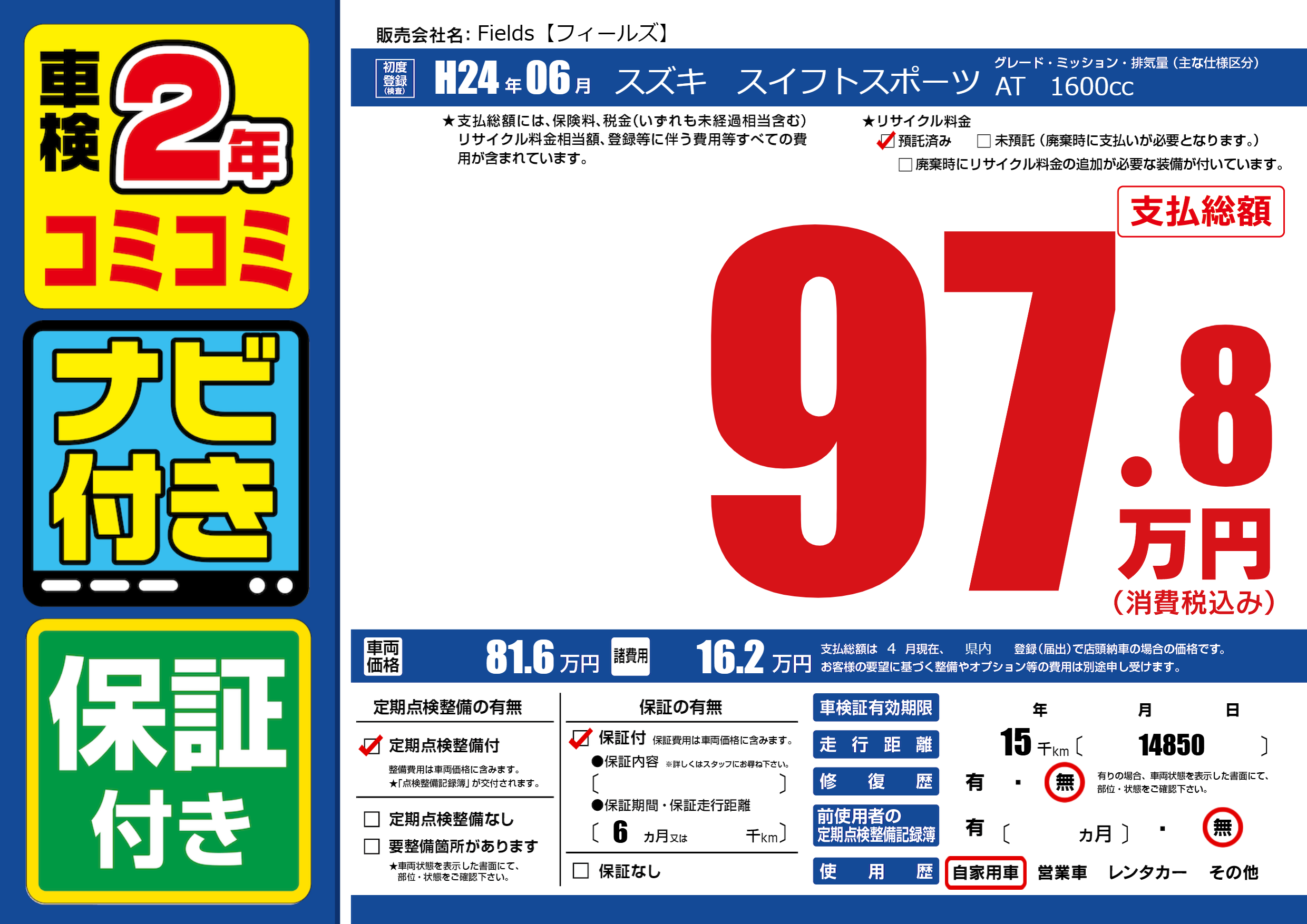 保証付き 保証内容(---) 6ヶ月または()千kmまで |
