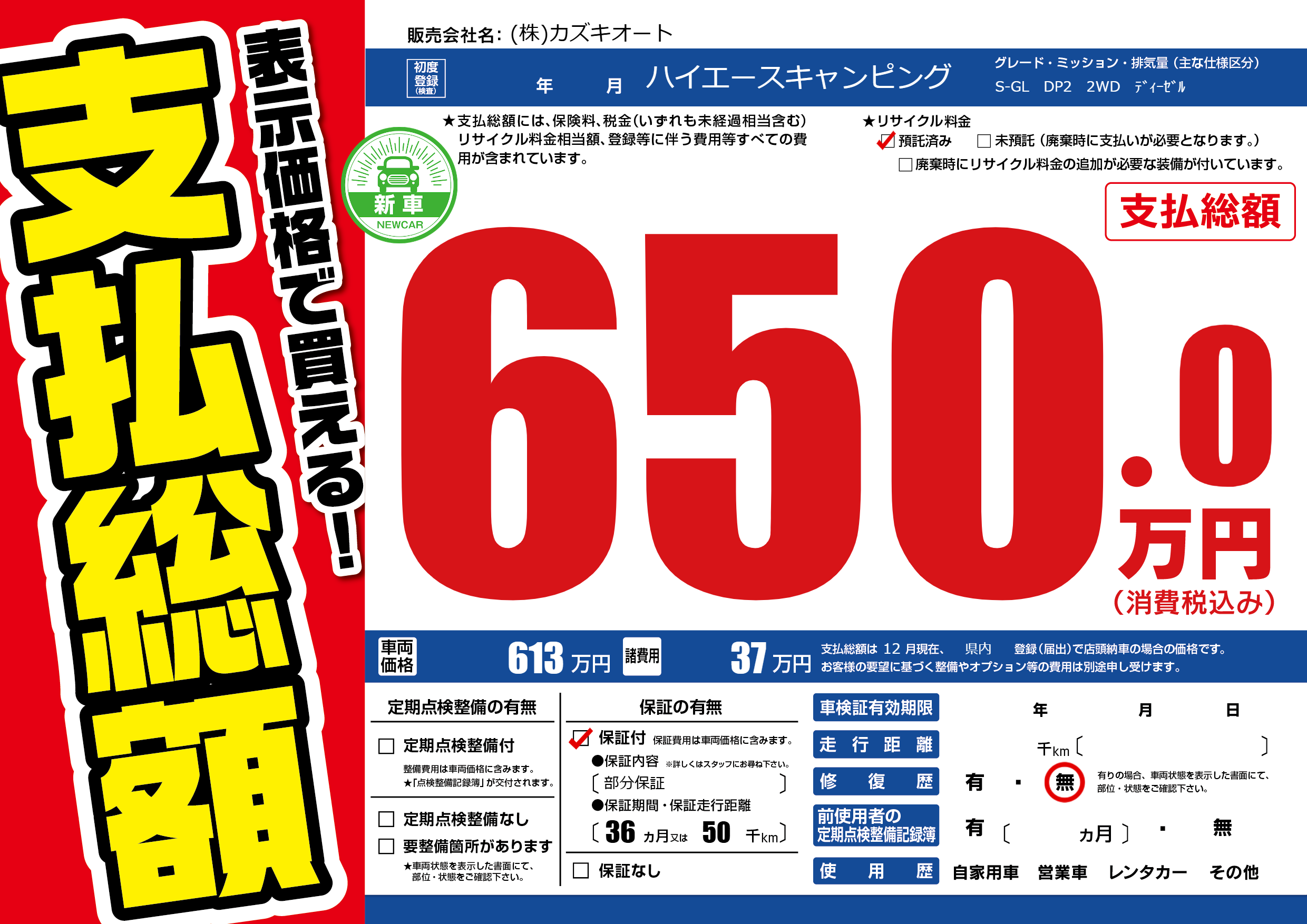 | 車名 | ハイエースキャンピング | グレード ミッション 排気量 |