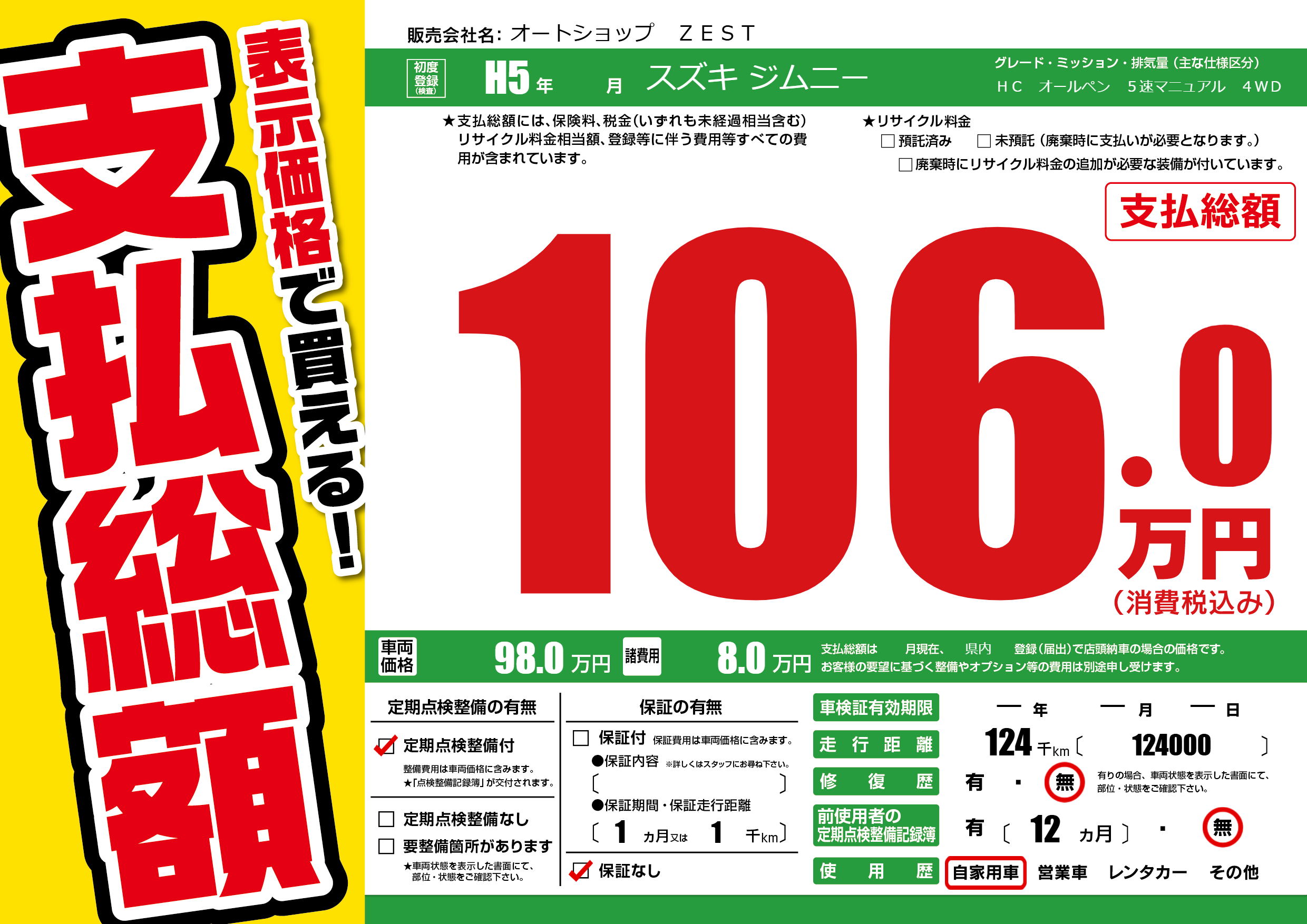| 走行キロ | 12.4万km | 初年度登録 | H5年---月 |